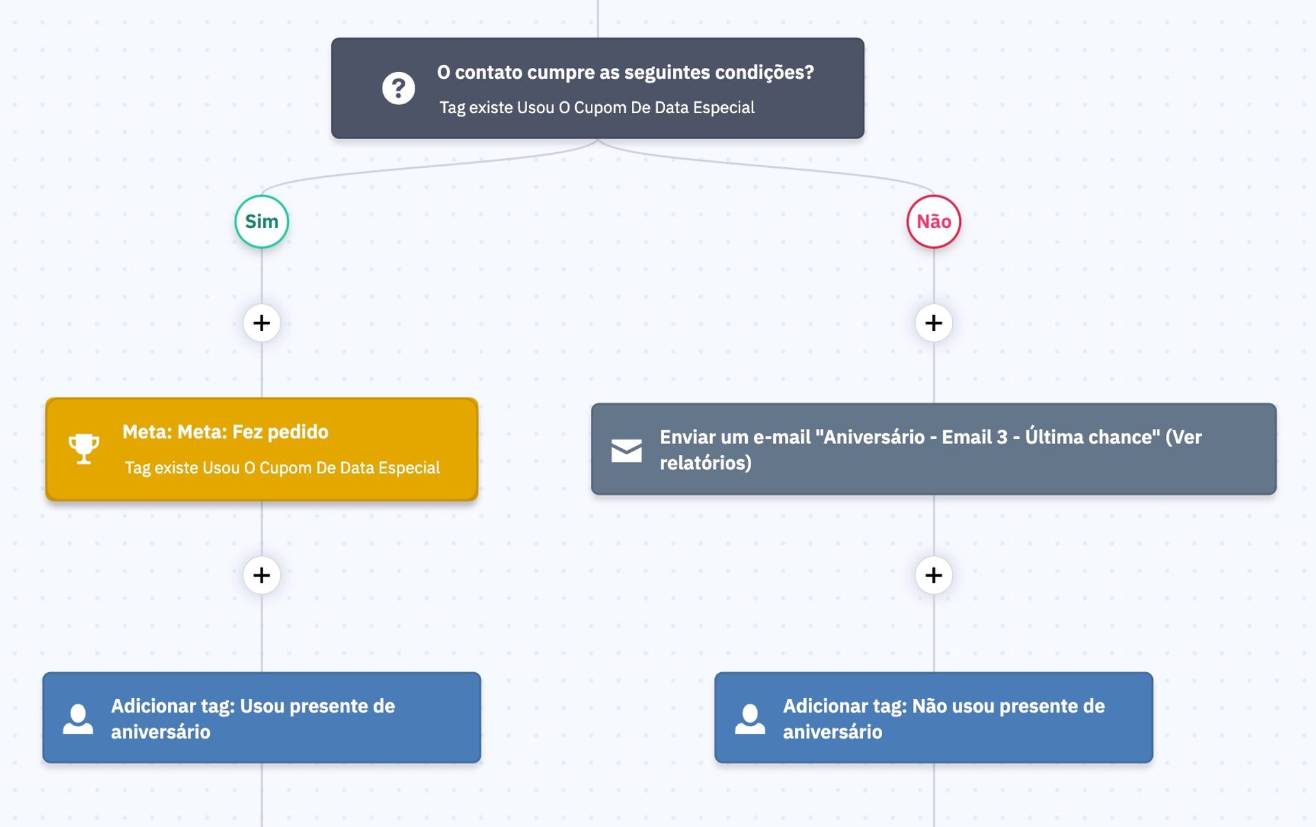 - Quando a pessoa usa o cupom, uma tag é aplicada no contato, o que permite que a equipe identifique que é um pedido feito na época do aniversário
