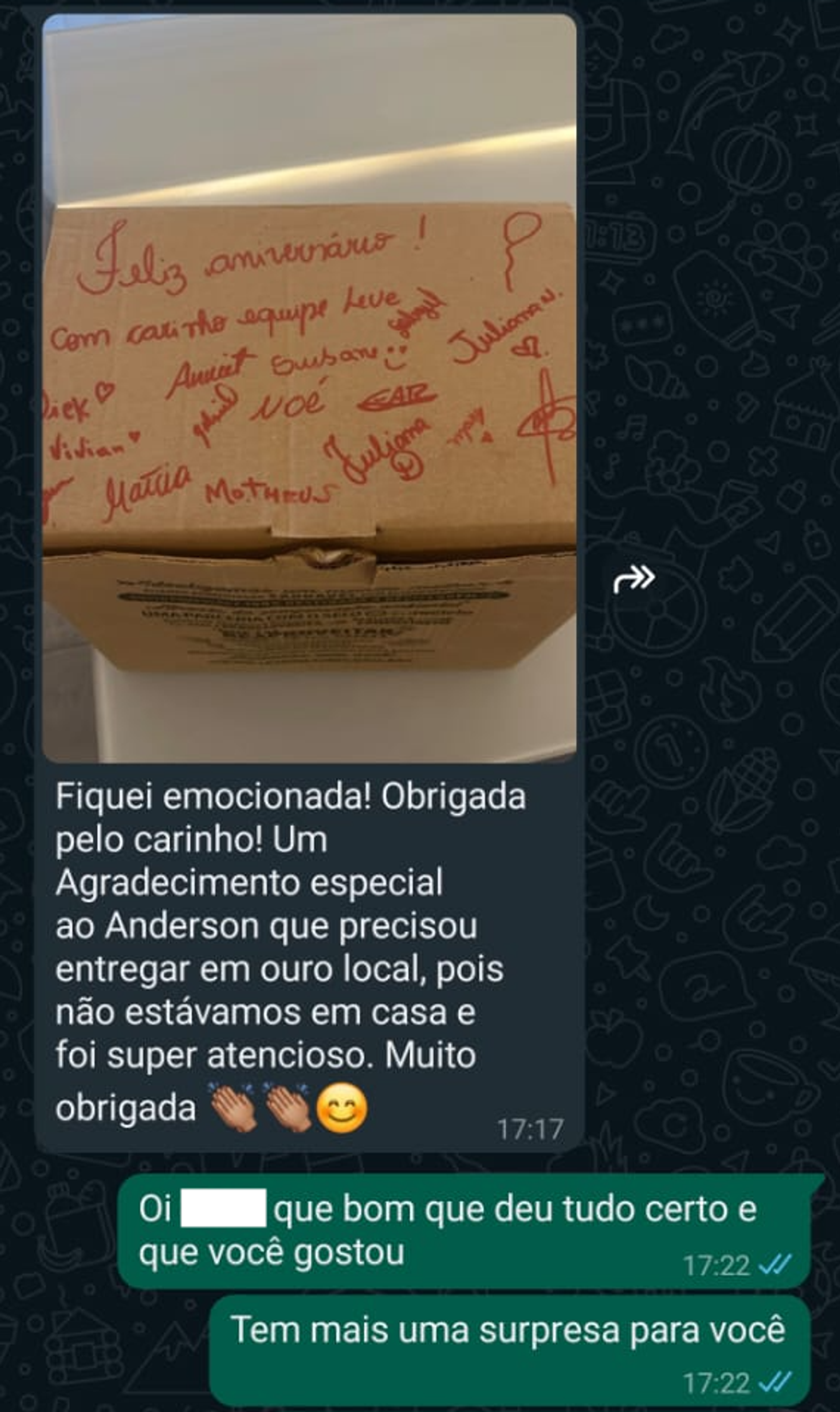 - Assim que o pedido é entregue, o cliente também recebe um vídeo no WhatsApp com os funcionários dando parabéns
