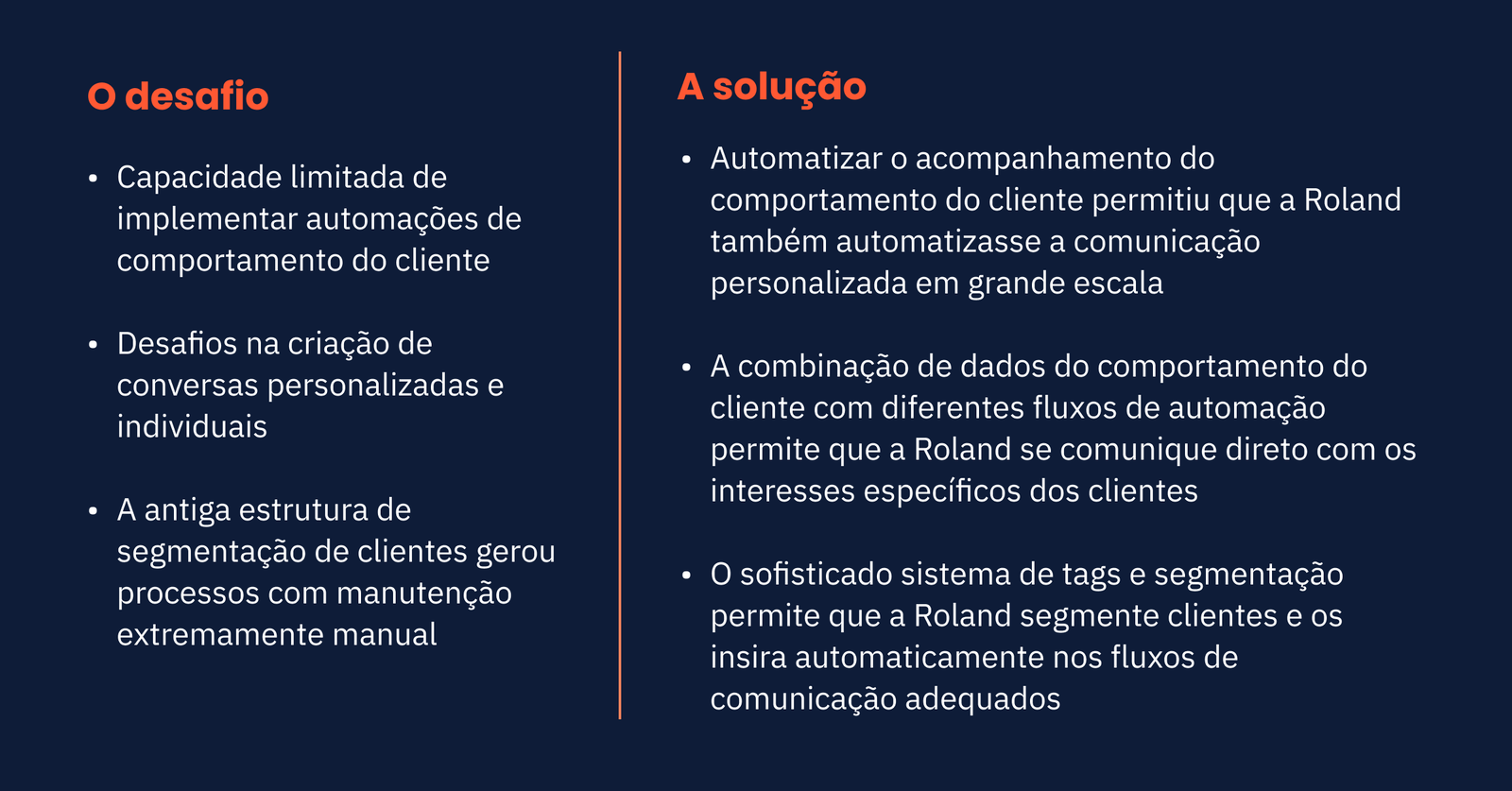 Como o antigo conjunto de ferramentas tecnológicas não acompanhava o crescimento da empresa, a Roland iniciou uma busca em grande escala por uma nova solução de CRM. Paul queria interações mais personalizadas e individuais com os clientes. "Era um processo muito manual. Tudo o que tínhamos eram grupos de interesse em produtos, basicamente. E o processo manual de colocar leads nesses grupos era um verdadeiro pesadelo." Com mais de 1.200 produtos diferentes, falar direto com os clientes sobre os produtos de interesse era impossível sem recursos de automação mais sofisticados. "Era possível enviar emails transacionais com base nas atualizações no portal do cliente. Mas não era possível personalizá-los, pois não tínhamos esse vínculo direto entre o portal do cliente e o banco de dados de CRM."