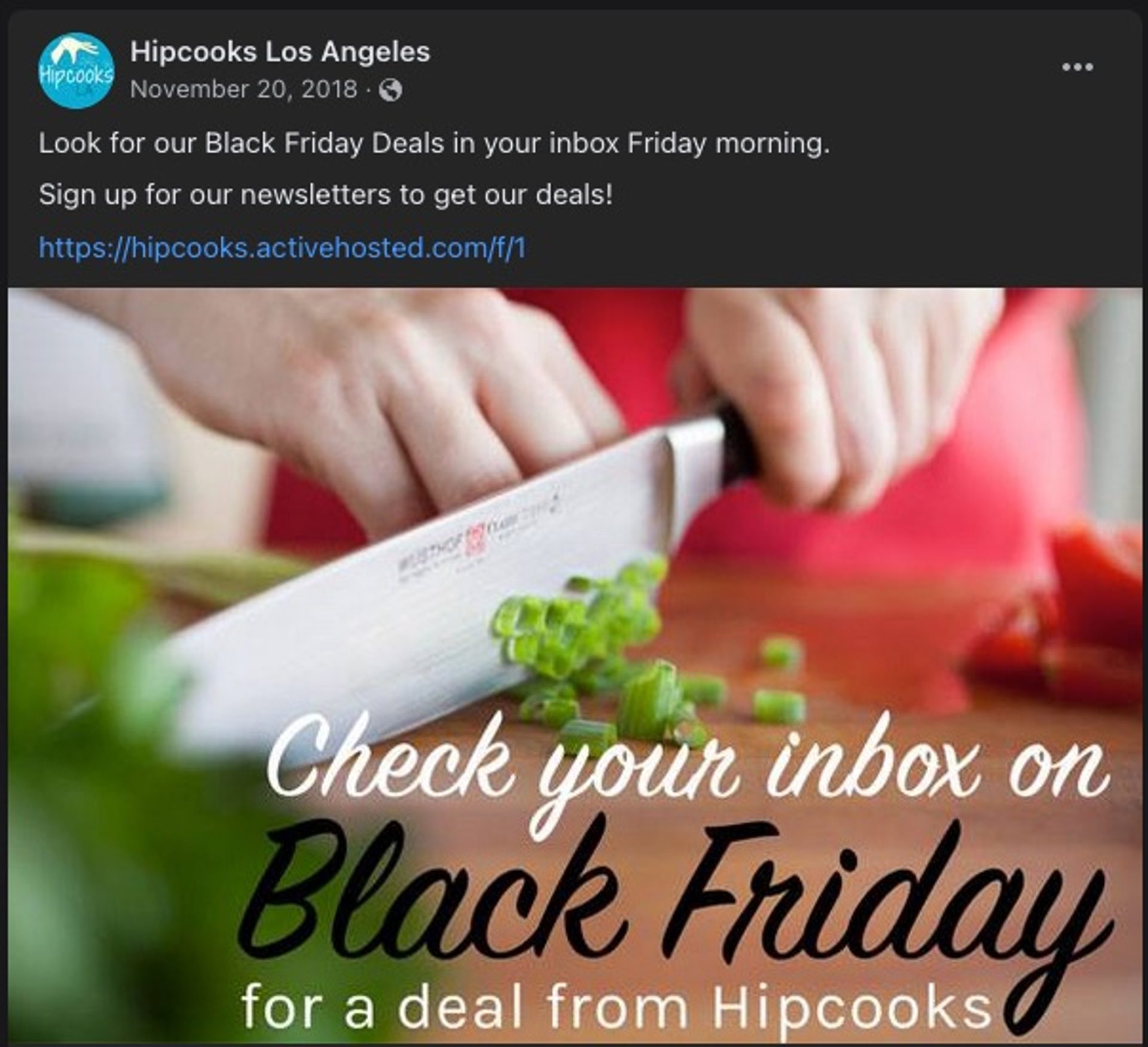 Aumente o hype em torno das suas ofertas da Black Friday fazendo com que as pessoas se inscrevam em sua newsletter. A Hipcooks (também cliente da ActiveCampaign) informou aos seguidores que as ofertas da Black Friday seriam compartilhadas pela newsletter por email.