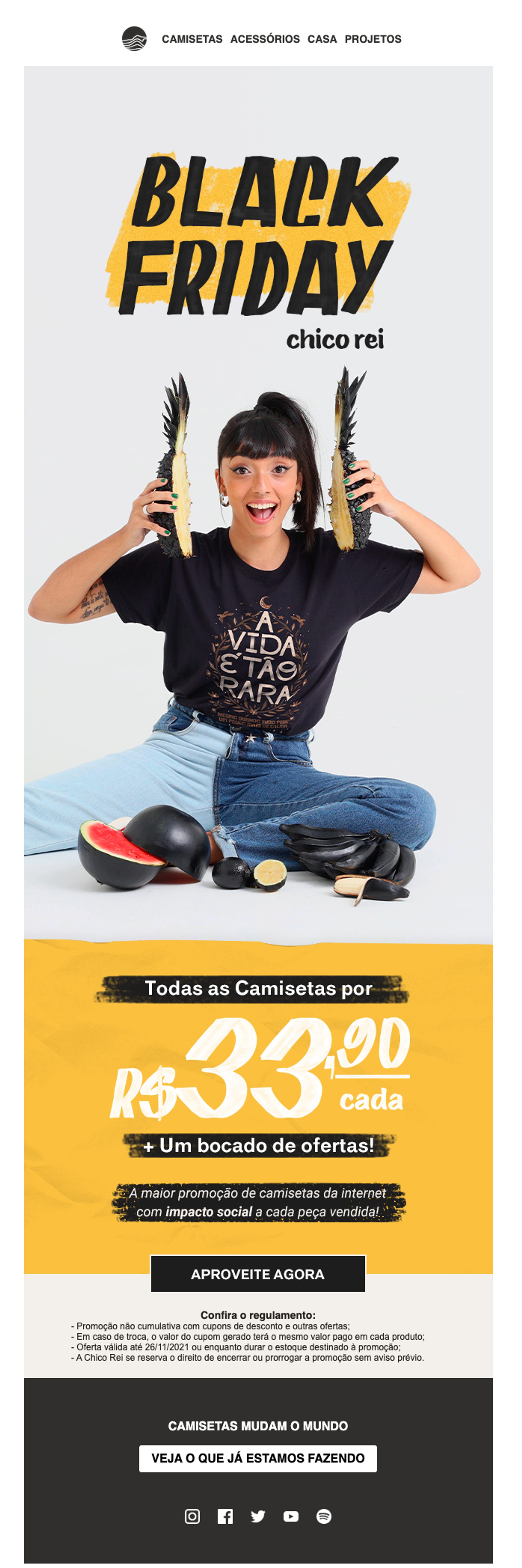 A Chico Rei apresenta uma foto (com uma composição fantástica) de uma modelo usando uma de suas camisetas, além de elementos gráficos bonitos e uma oferta bem definida. Isso cria um visual muito mais interessante do que apenas uma foto de uma camiseta.