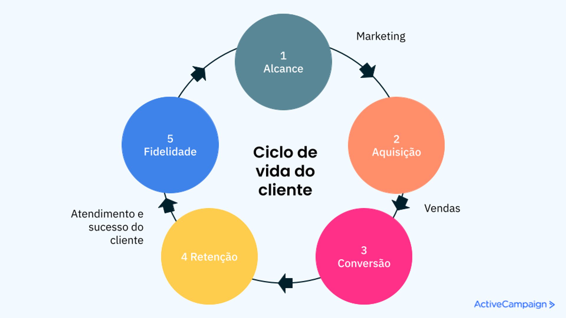 O ciclo de vida do CRM é como um looping infinito, dado que os clientes fidelizados se tornam promotores da nossa marca. Eles indicam para outras pessoas e passam a fazer parte das etapas de "Alcance" desses novos clientes.