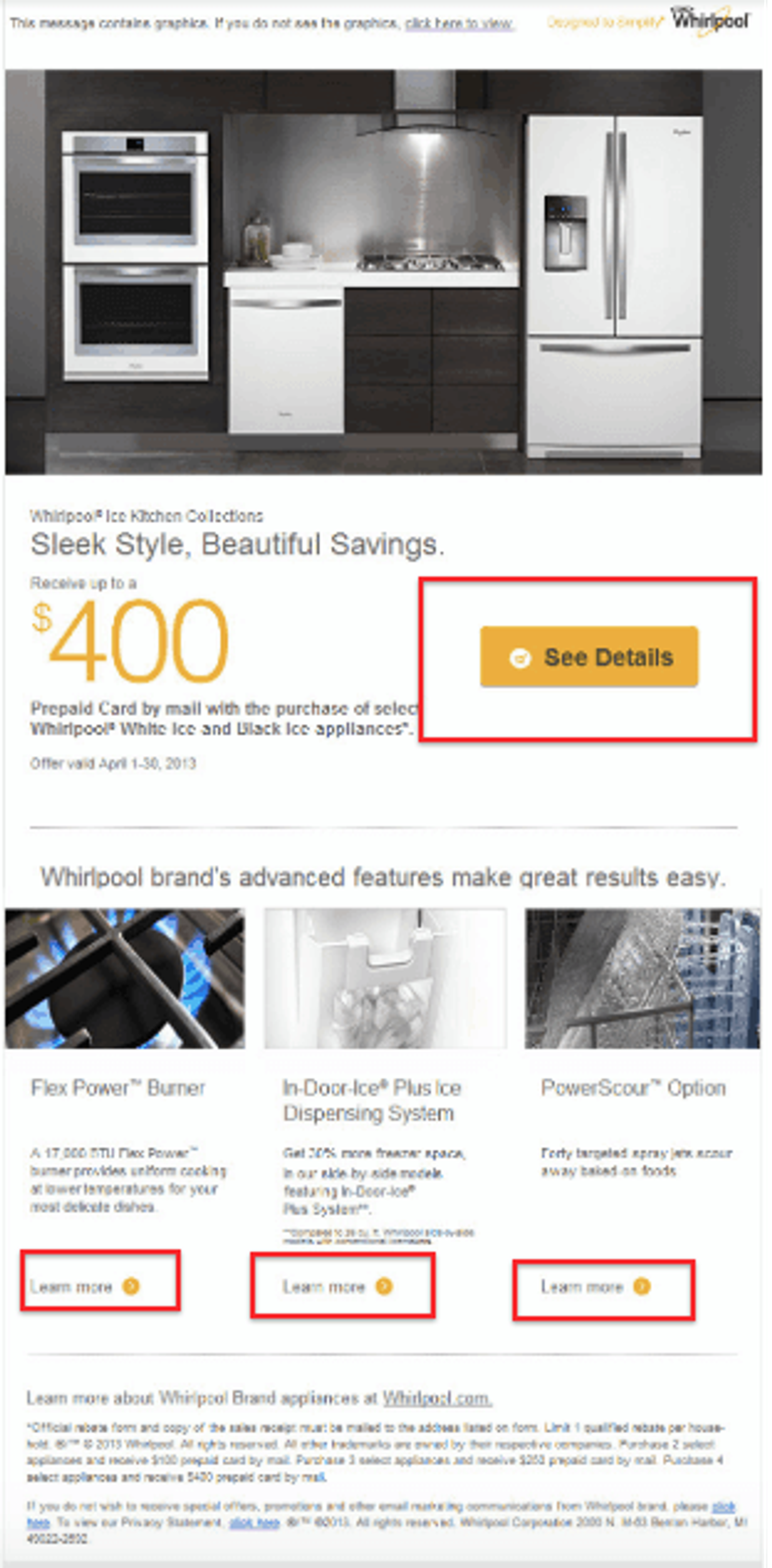 Em 2013 (conforme a Marketing Sherpa), a Whirlpool lançou uma campanha de email marketing com quatro calls to action relacionadas à sua nova coleção Ice Kitchen.