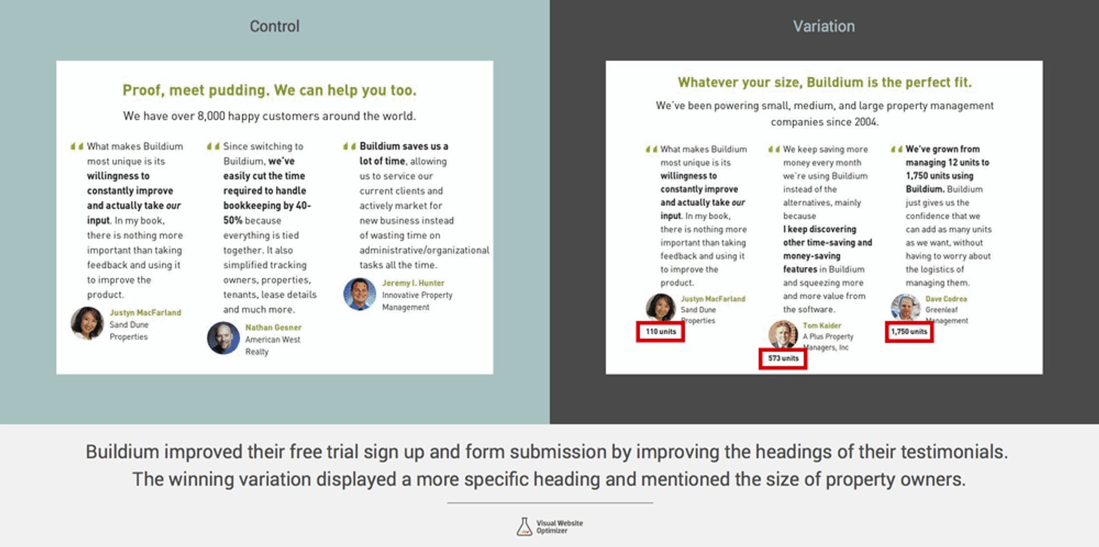 Um estudo de caso da VWO mostrou que usar depoimentos de clientes direcionados aumentou significativamente as conversões da Buildium, uma empresa de software de gerenciamento de propriedades.