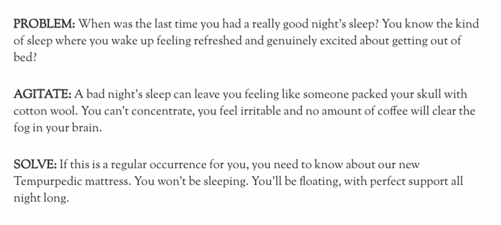 Isso é muito semelhante à fórmula PAS (problema, agitação, solução) que os redatores antigos usam há décadas… mas com a adição de um novo componente visceral — a gravidade emocional. Só depois de saber de qual inferno a landing page vai salvar a pessoa visitante é que você pode garantir que a ação que ela deve realizar — a solução — será um céu.