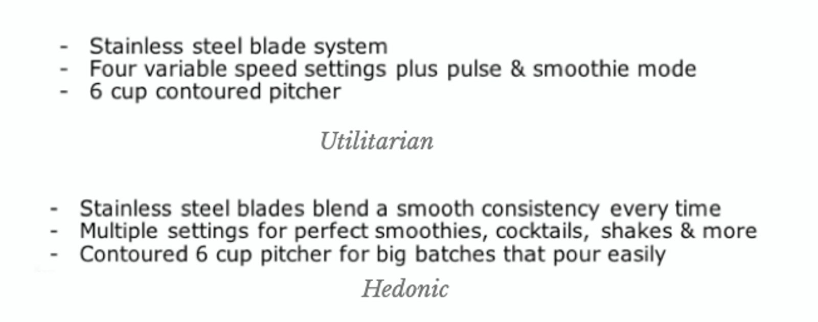 Um estudo da ConversionXL mostra como a redação utilitária e a hedônica podem afetar as percepções de preço de um produto. Neste caso, um liquidificador.