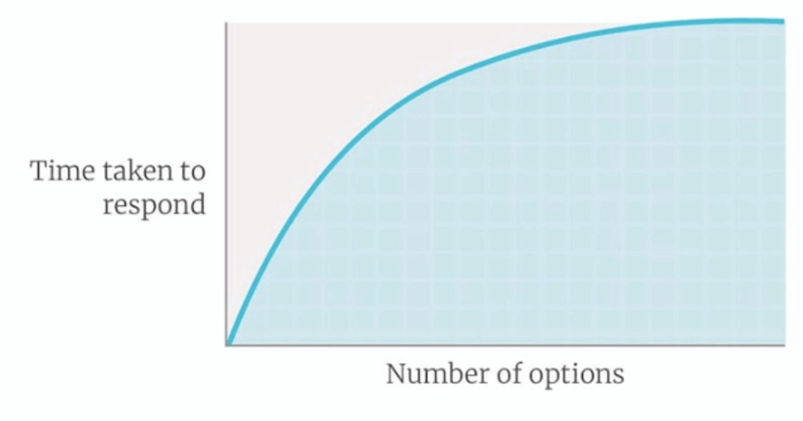 A lei de Hick diz que as pessoas demoram mais para tomar uma decisão quando há várias opções de escolha. E quanto mais tempo leva para tomar uma decisão, maior a probabilidade de desistência.