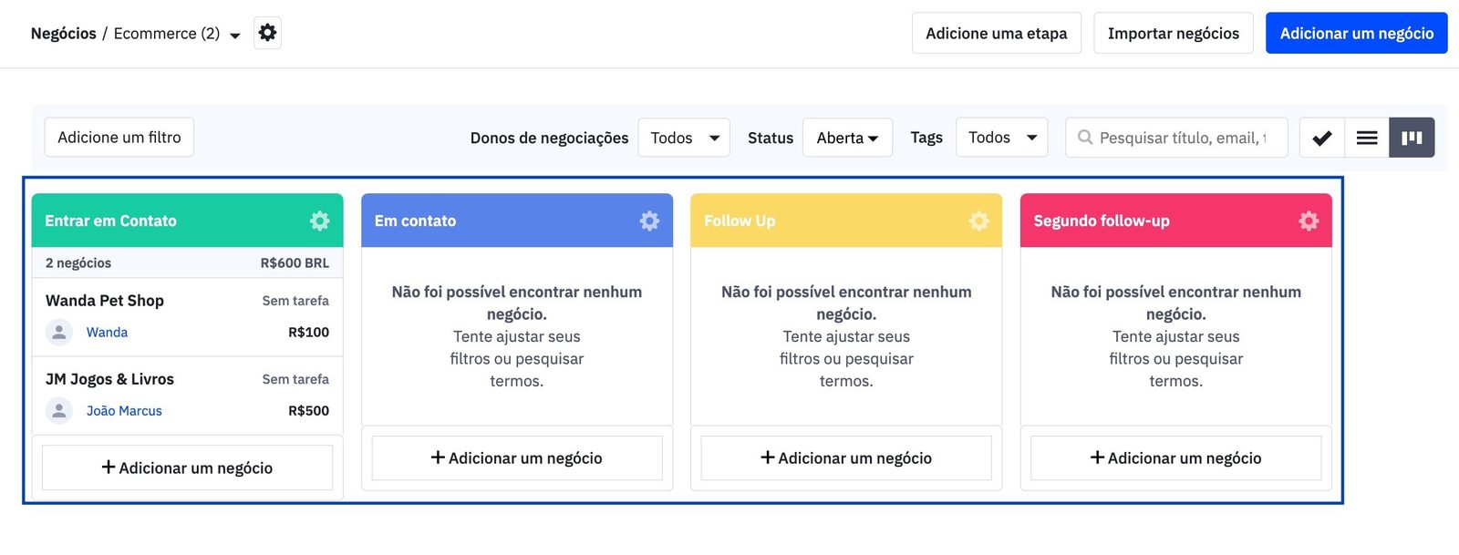 Por exemplo, você pode definir uma etapa de "entrar de contato" para todos os novos leads para indicar as pessoas que o time de vendas ainda não entrou em contato.