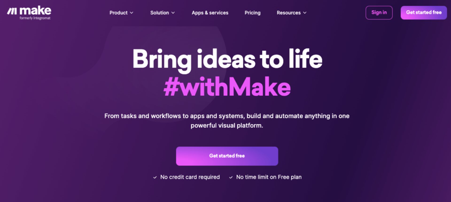 A Make coloca em destaque sua plataforma visual intuitiva de arrastar e soltar e facilita a criação de fluxos de trabalho complexos e operações comerciais sem codificação. Além da automação de marketing e vendas, a Make afirma que sua plataforma pode economizar o tempo das equipes de TI, RH e operações.