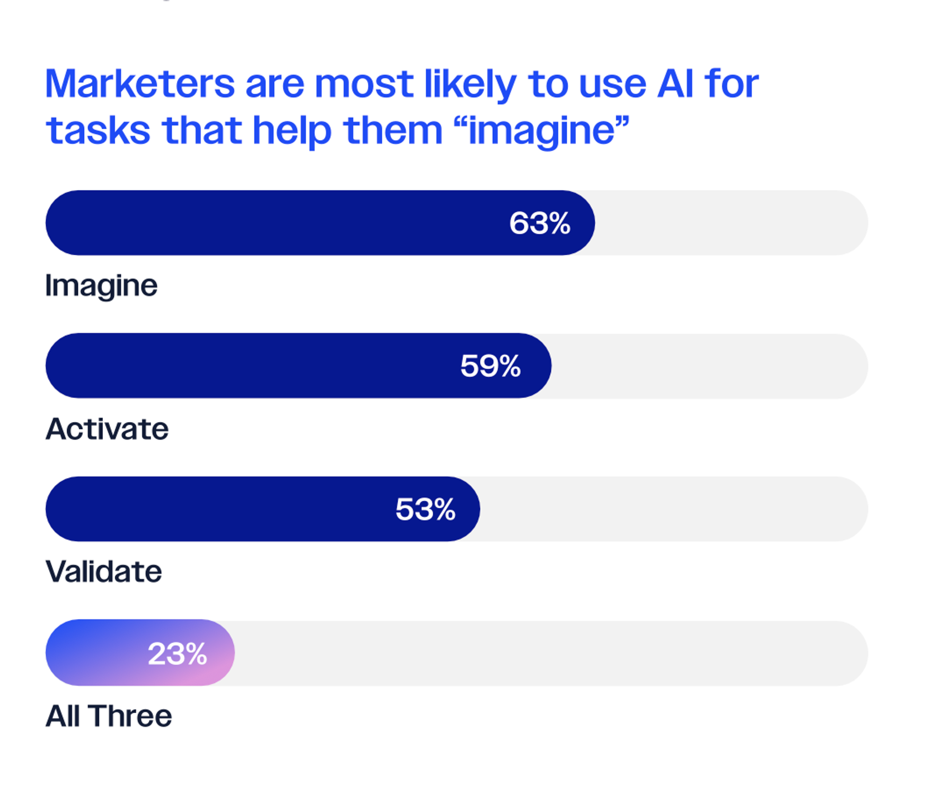 Nosso recente relatório de dados falou com mil profissionais de marketing, revelando uma lacuna impressionante. Enquanto 82% dos profissionais de marketing usam IA, apenas 23% a usam nos três pilares. A maioria se concentra no pilar Imaginar (63%) e não usa os recursos de validação de forma adequada.