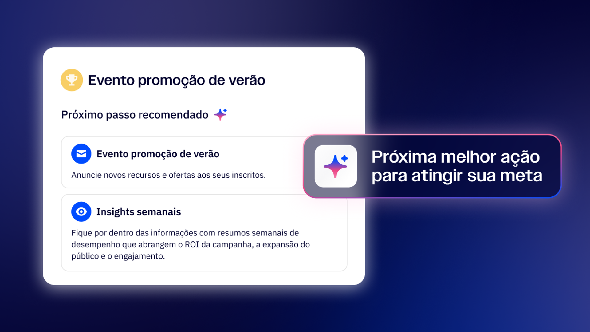 | Criador de campanhas por IA: crie conceitos completos de campanha usando instruções estratégicas | Automações sugeridas por IA: execute estratégias de campanha comprovadas automaticamente | Active Intelligence: Insights: transforme dados em inteligência estratégica usando conversas |