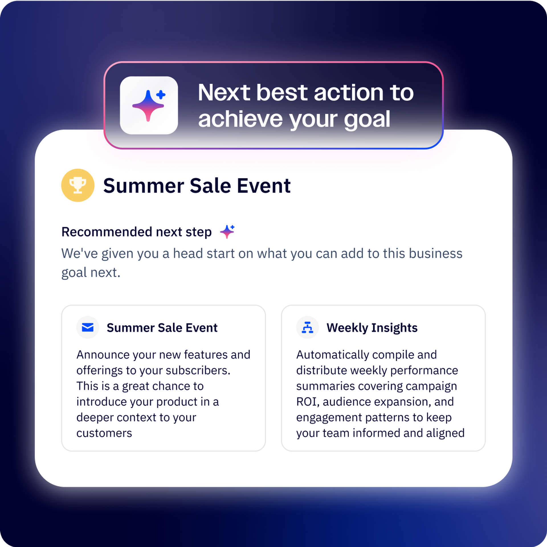 | Criador de kit de marca por IA: garanta uma estratégia de marca consistente em todos os pontos de contato | Envio preditivo: otimize o tempo para obter o máximo de engajamento em nível individual | Metas de negócios: acompanhe o progresso em direção aos objetivos e obtenha recomendações baseadas em IA |