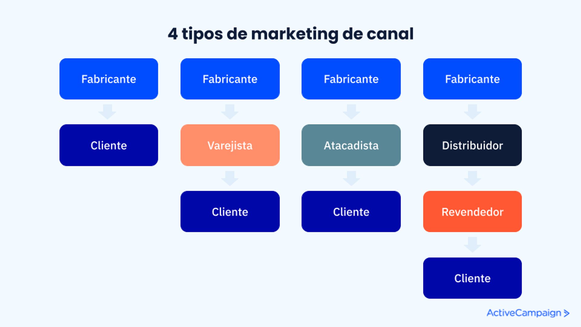 Há quatro tipos de relacionamentos de marketing de canal, que podem incluir revendedores, afiliados, consultores, distribuidores e outros tipos de parceiros. Eles são: