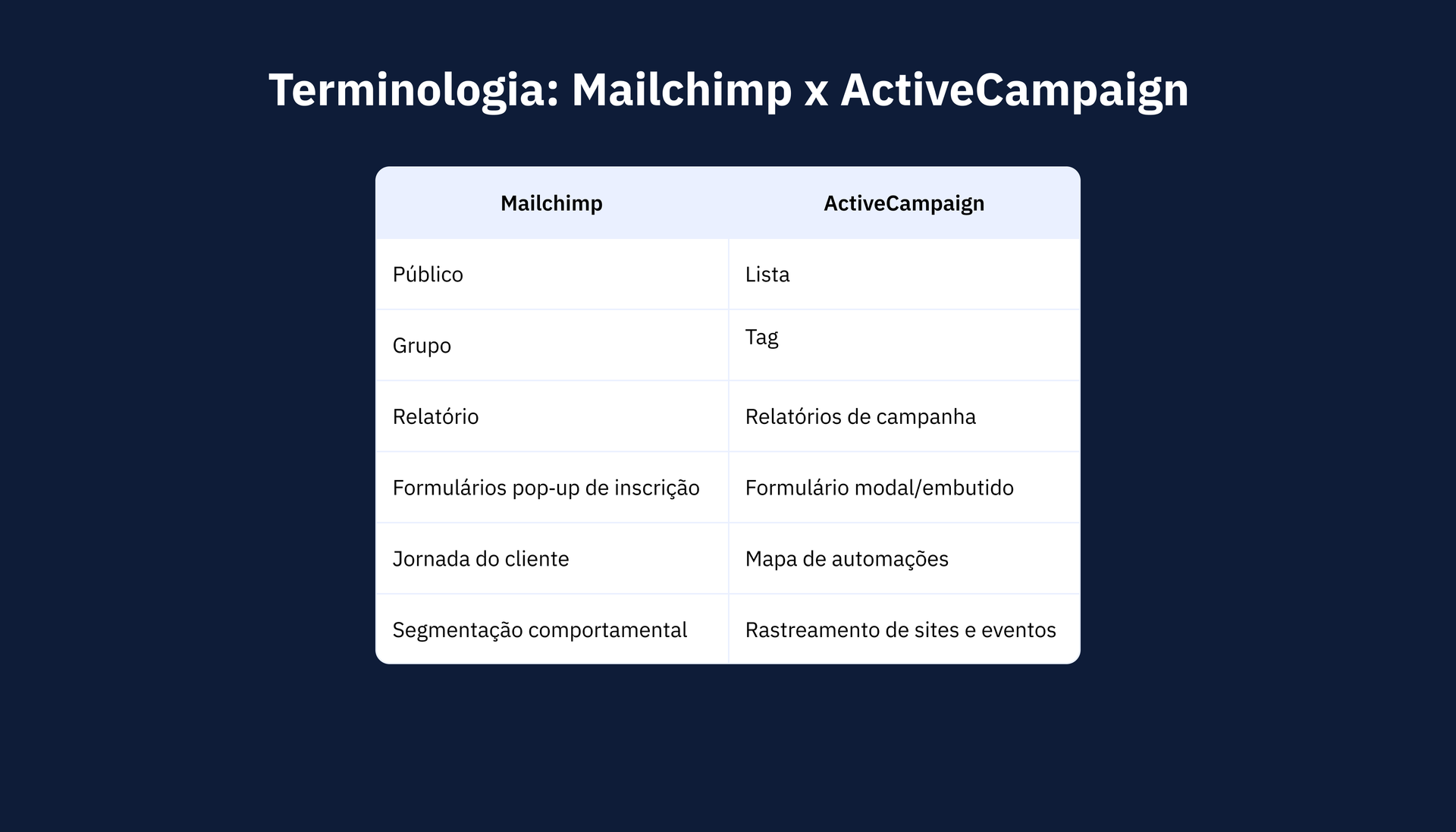 Diferenças terminológicas entre o Mailchimp e a ActiveCampaign