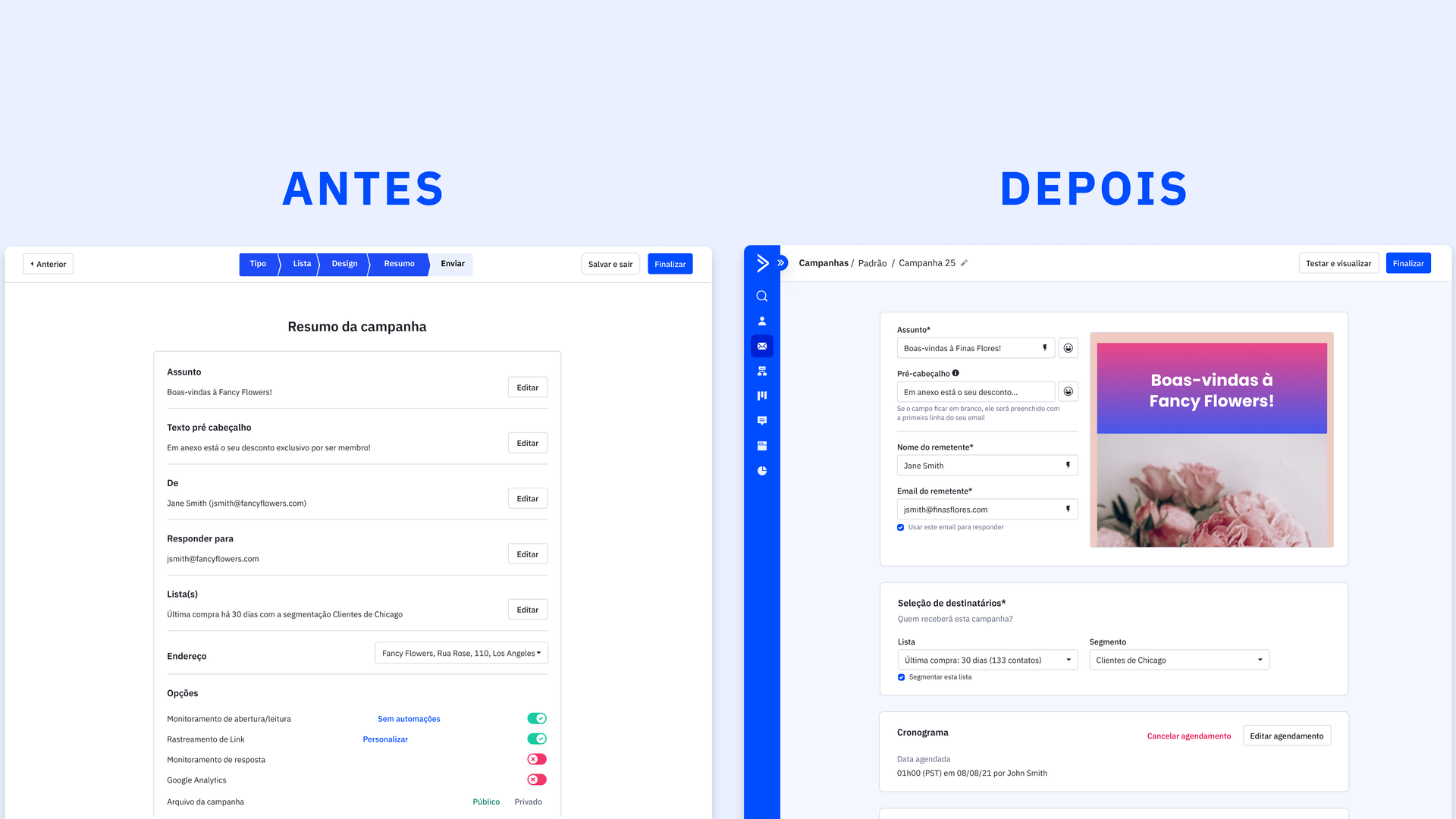 Mais flexibilidade: Experimente designs, modifique configurações e otimize a segmentação de público-alvo com facilidade. Você não precisa mais ficar alternando entre várias páginas para lidar com diferentes aspectos da campanha. Desde a criação da linha de assunto perfeita até a visualização do design do email e a seleção dos destinatários, gerencie toda a jornada da campanha em um espaço único e coeso.
