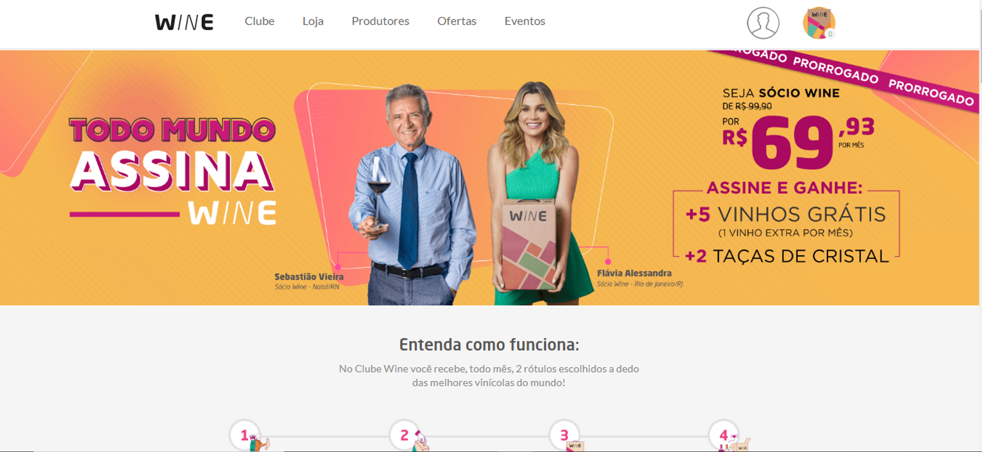 Outra página de vendas interessante é a da Wine, clube de assinatura de vinho. Ela já explora o valor em desconto e, ainda, usa um recurso importante: prova social.