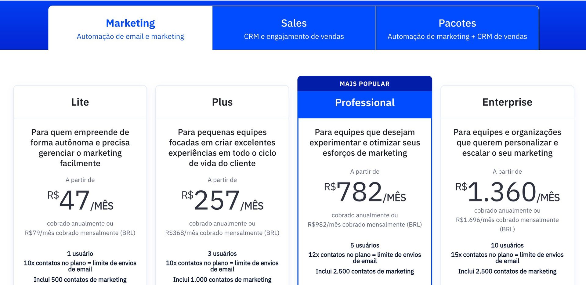 A ActiveCampaign oferece 4 planos, com preços exatos que dependem do número de contatos que você tem. Abaixo estão os preços iniciais de cada plano.