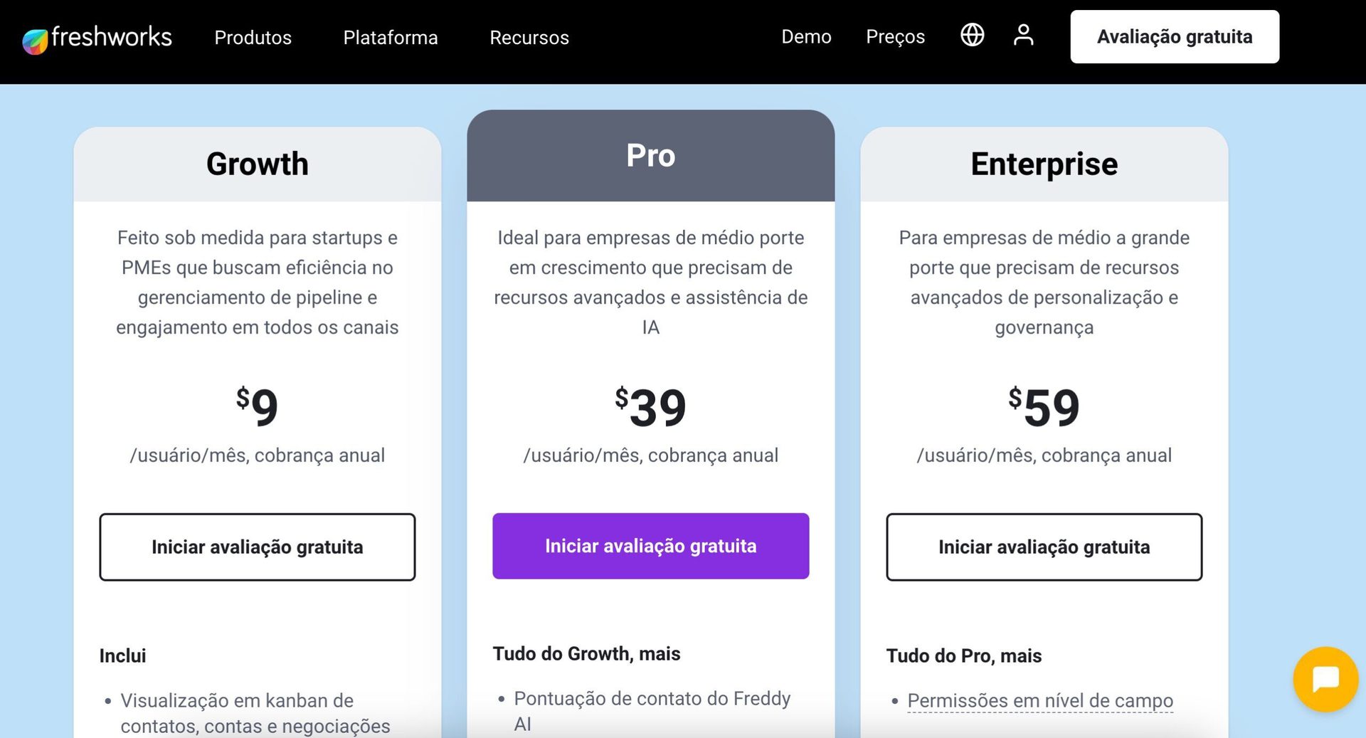 A Freshworks oferece 3 planos para seu CRM, incluindo uma opção gratuita. Os planos são cobrados por usuário por mês, mas você também pode adquirir funcionalidades adicionais, como o aumento de conversas com bots.