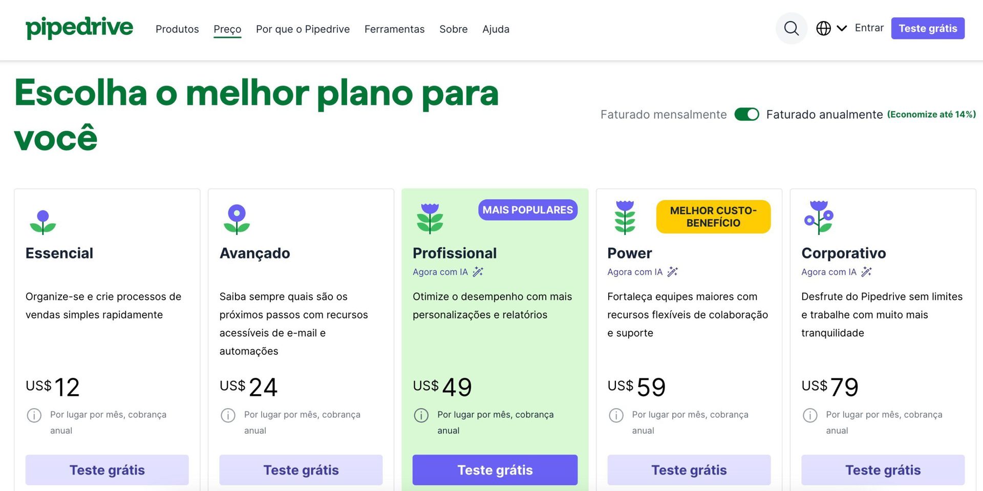 O Pipedrive oferece 4 planos, cada um cobrado pelo número de usuários por mês. Você também pode adquirir funcionalidades adicionais, como Leadboosters e Smart Docs.