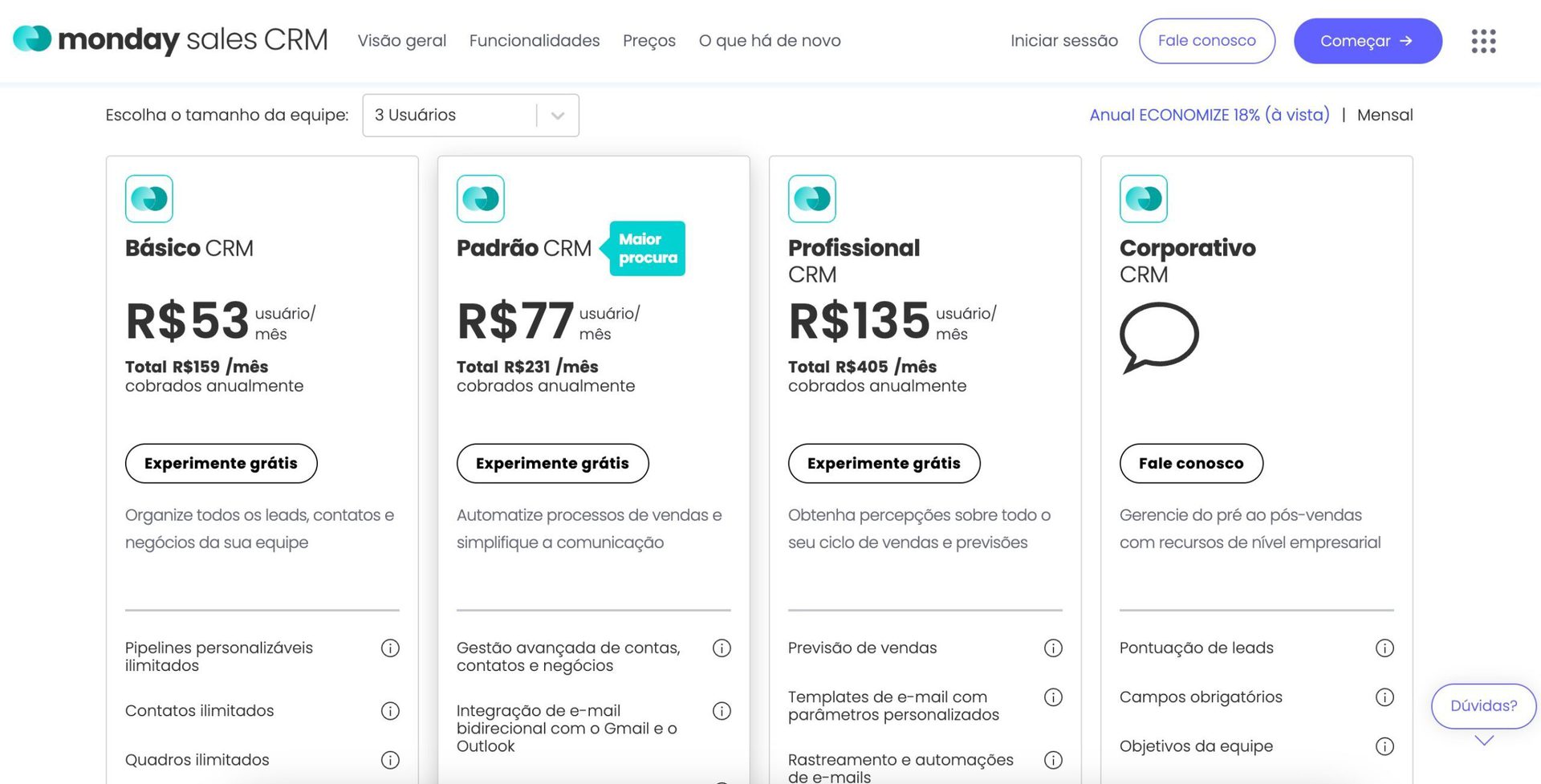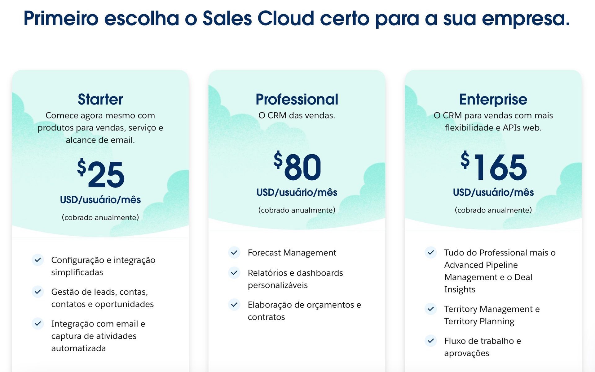 O Salesforce tem várias ferramentas e produtos diferentes, mas seu CRM de vendas oferece 3 planos, cada um cobrado pelo número de usuários.