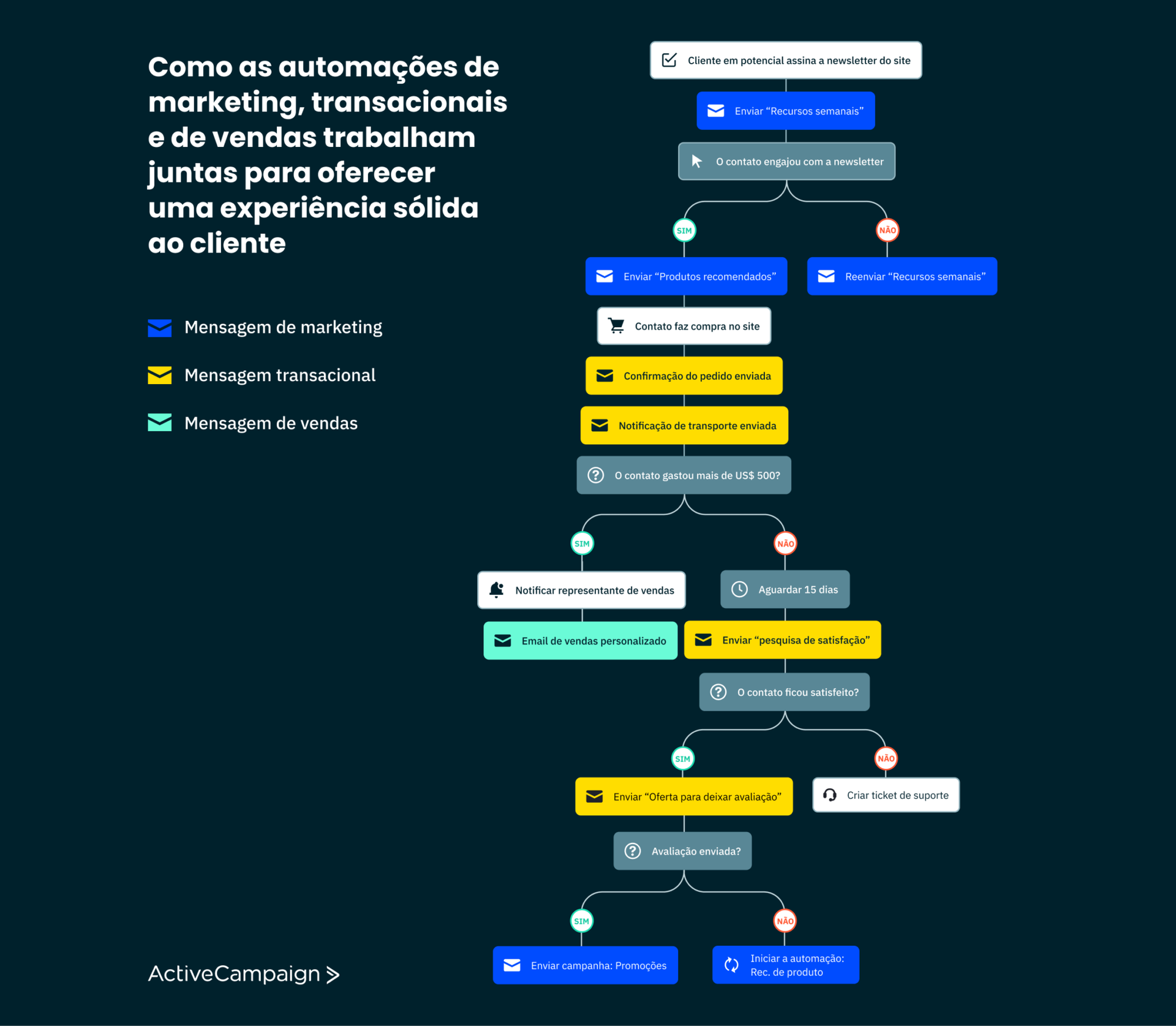 Isso pode ser difícil para empresas em crescimento, pois as comunicações transacionais geralmente vêm de ferramentas não relacionadas a vendas e marketing, dificultando o alinhamento de mensagens. Mas essa dificuldade acaba no dia de hoje, em que a ActiveCampaign anuncia uma maneira de reunir essas mensagens como nunca antes.