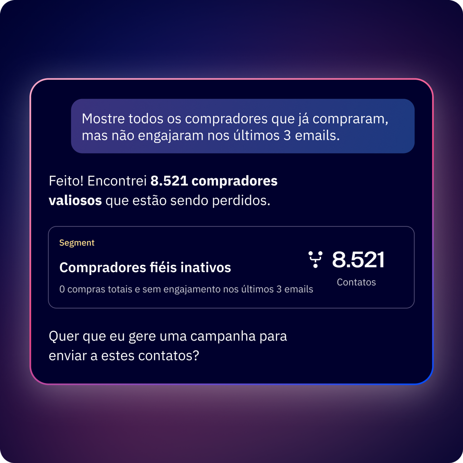 Diga ao assistente de IA: "Adicione todos que clicaram no meu último email ao segmento VIP" ou "Mostre o desempenho da campanha no T3 e identifique quais linhas de assunto geraram mais aberturas" e observe enquanto ele executa as tarefas usando seus dados reais.