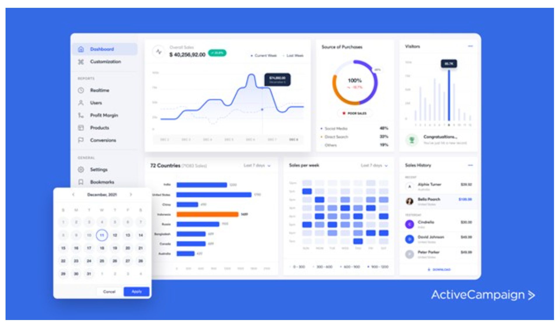 O CRM da ActiveCampaign, por exemplo, permite um acompanhamento muito próximo de sua base de clientes, fornecendo os KPIs mais importantes para que você possa entender realmente quem é o seu cliente e como vender mais.