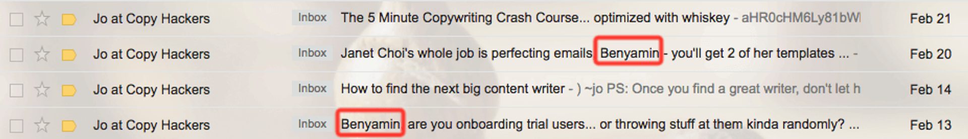 Joanna Wiebe usou isso para promover um post de blog recente no Copy Hackers. A linha de assunto dela foi “Convites de casamento = copy?”