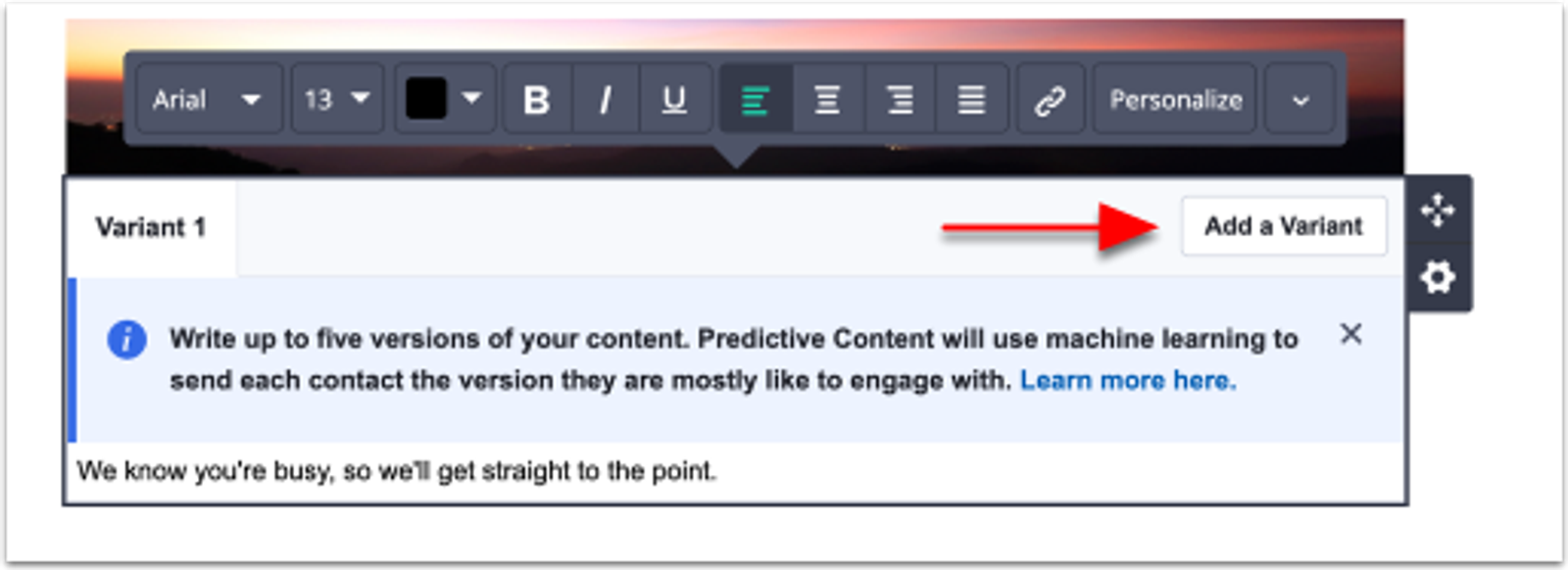 A ActiveCampaign usa aprendizado de máquina para personalizar o conteúdo do email automaticamente com base no comportamento anterior de cada contato. Assim, os contatos recebem o conteúdo mais relevante para eles, aumentando a eficácia sem exigir trabalho manual adicional.