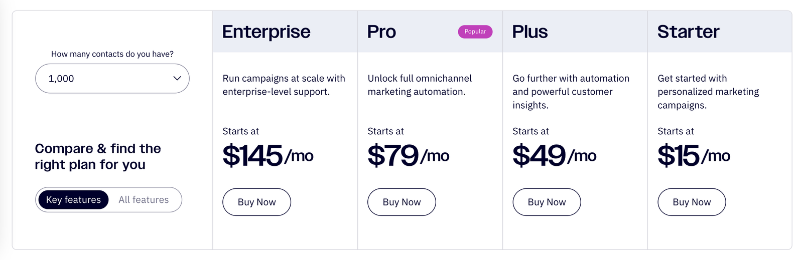 Passando para o plano Plus, você desbloqueia mais automação e insights poderosos de clientes por 49 dólares por mês com 1.000 contatos.