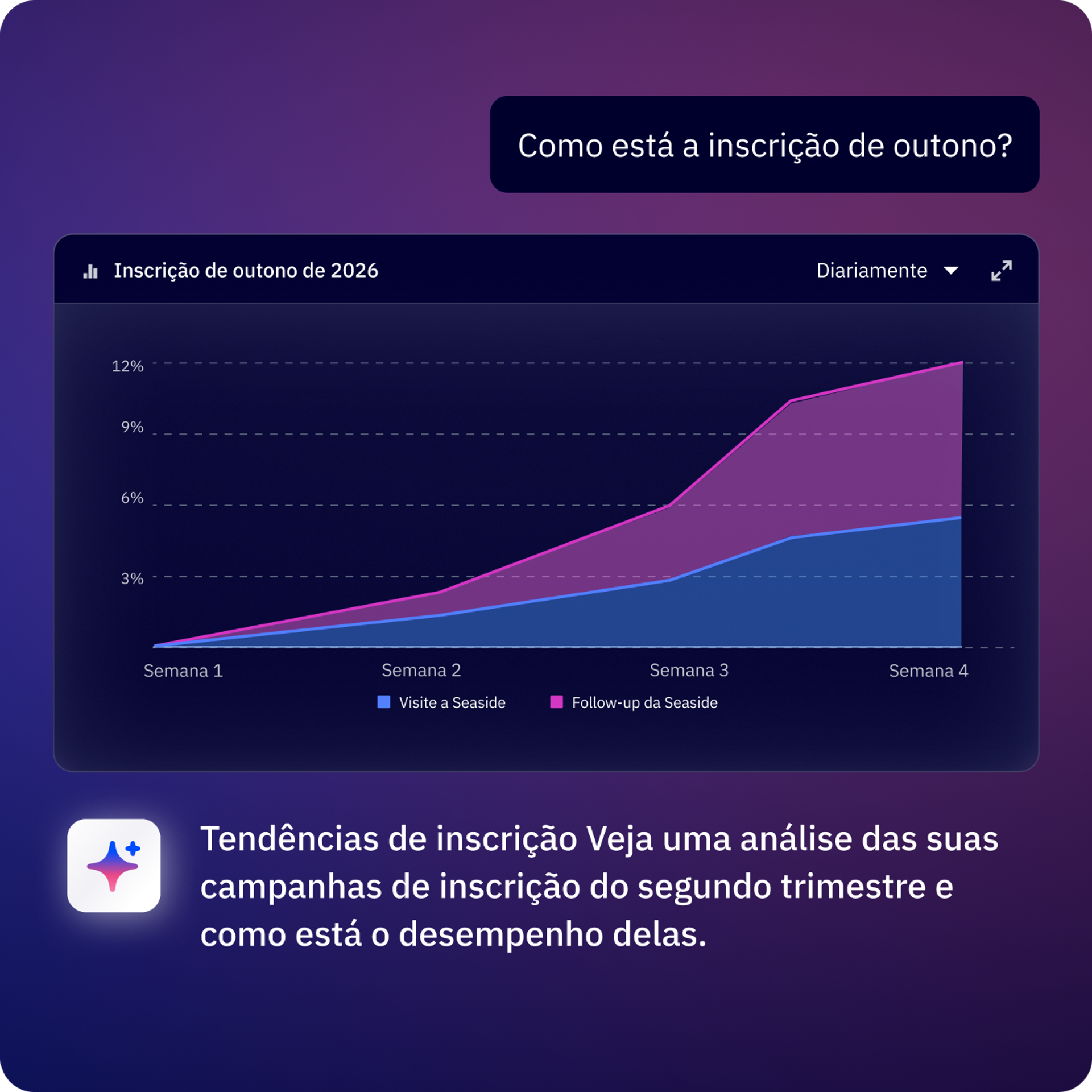 As ferramentas de IA tornam a análise muito acessível a todas as partes interessadas: elas descobrem proativamente insights baseados em tendências e recomendam ações diretamente no produto, ou você pode fazer consultas sobre suas campanhas usando o Active Intelligence. Ele descobrirá imediatamente insights, incluindo como otimizar e cumprir com suas metas de negócios especificadas.
