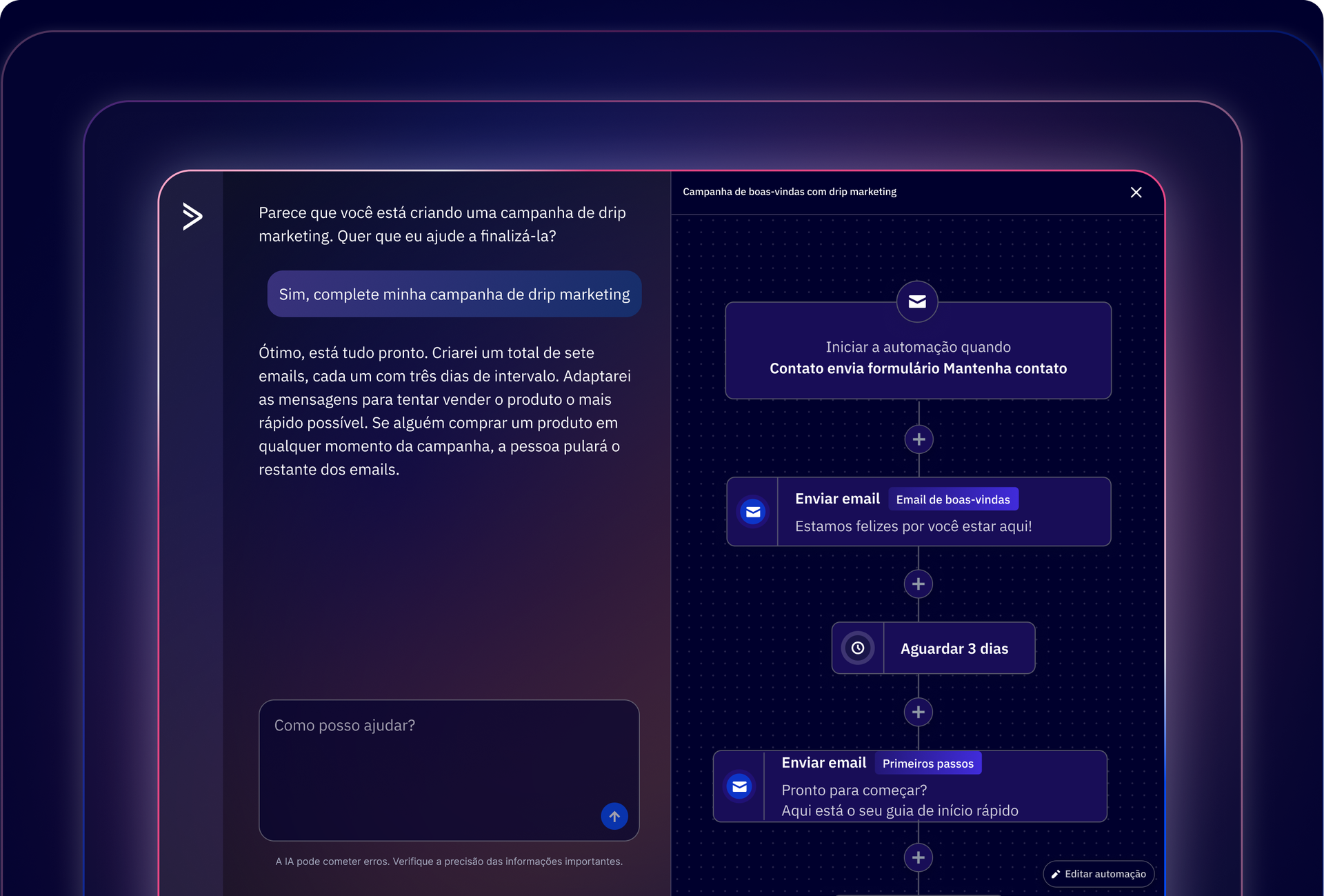 A ActiveCampaign prioriza orientações acionáveis, descobrindo padrões, explicando acionadores e incentivando a próxima melhor etapa com a IA.