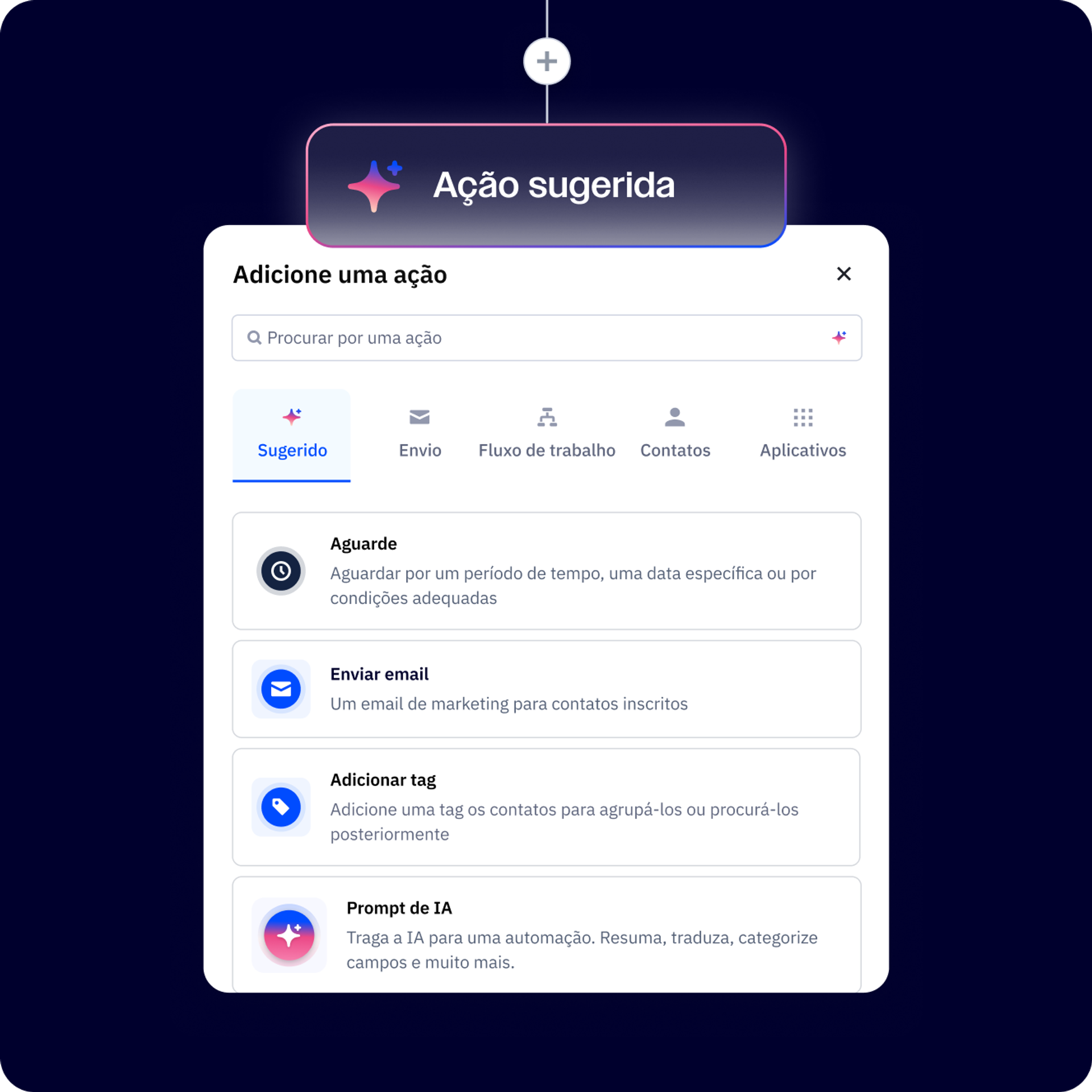 À medida que você cria suas automações, as ações sugeridas por IA da ActiveCampaign oferecem uma recomendação com base no comportamento do contato, no histórico de engajamento e nas práticas recomendadas do setor para sugerir as ações de maior impacto, facilitando a criação de automações.