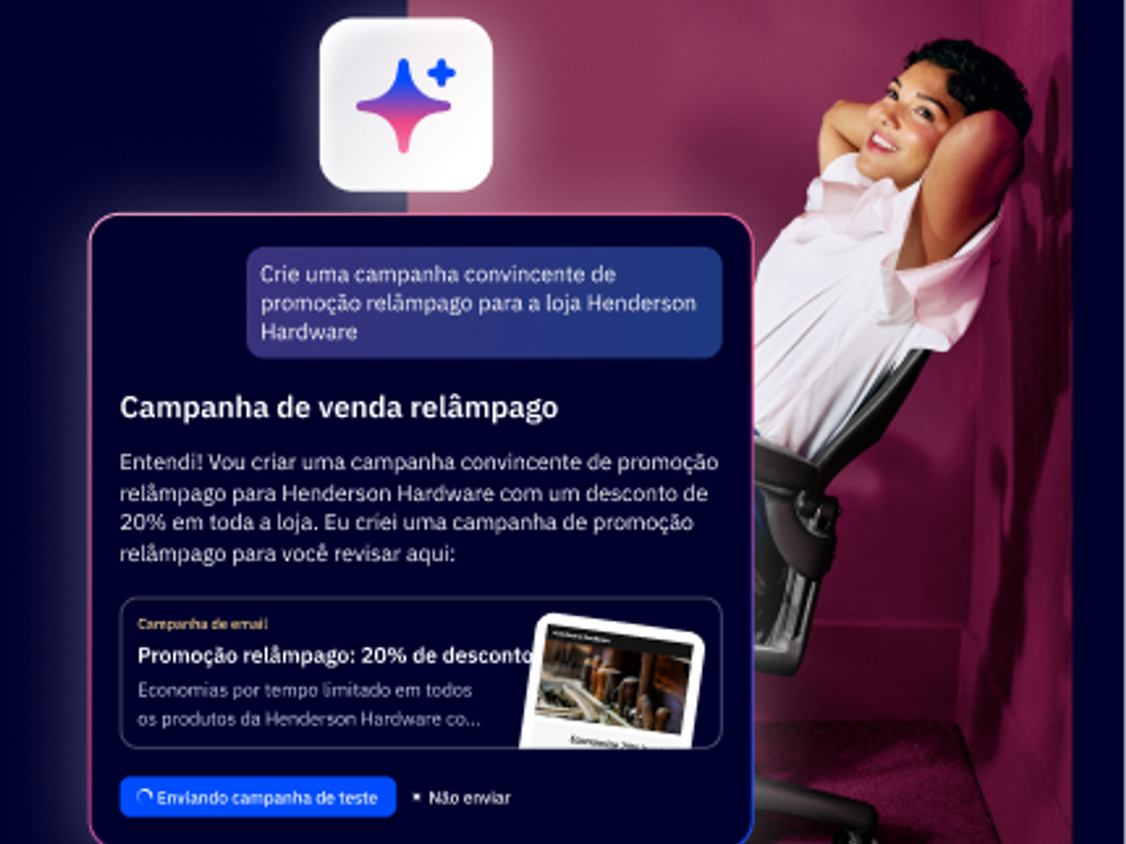 Use a Biblioteca de ações de IA (em inglês) para inserir um prompt de conversação, e a IA traduz instantaneamente seus objetivos em estratégias eficazes e focadas na conversão, desde assuntos persuasivos até a combinação ideal de canais.