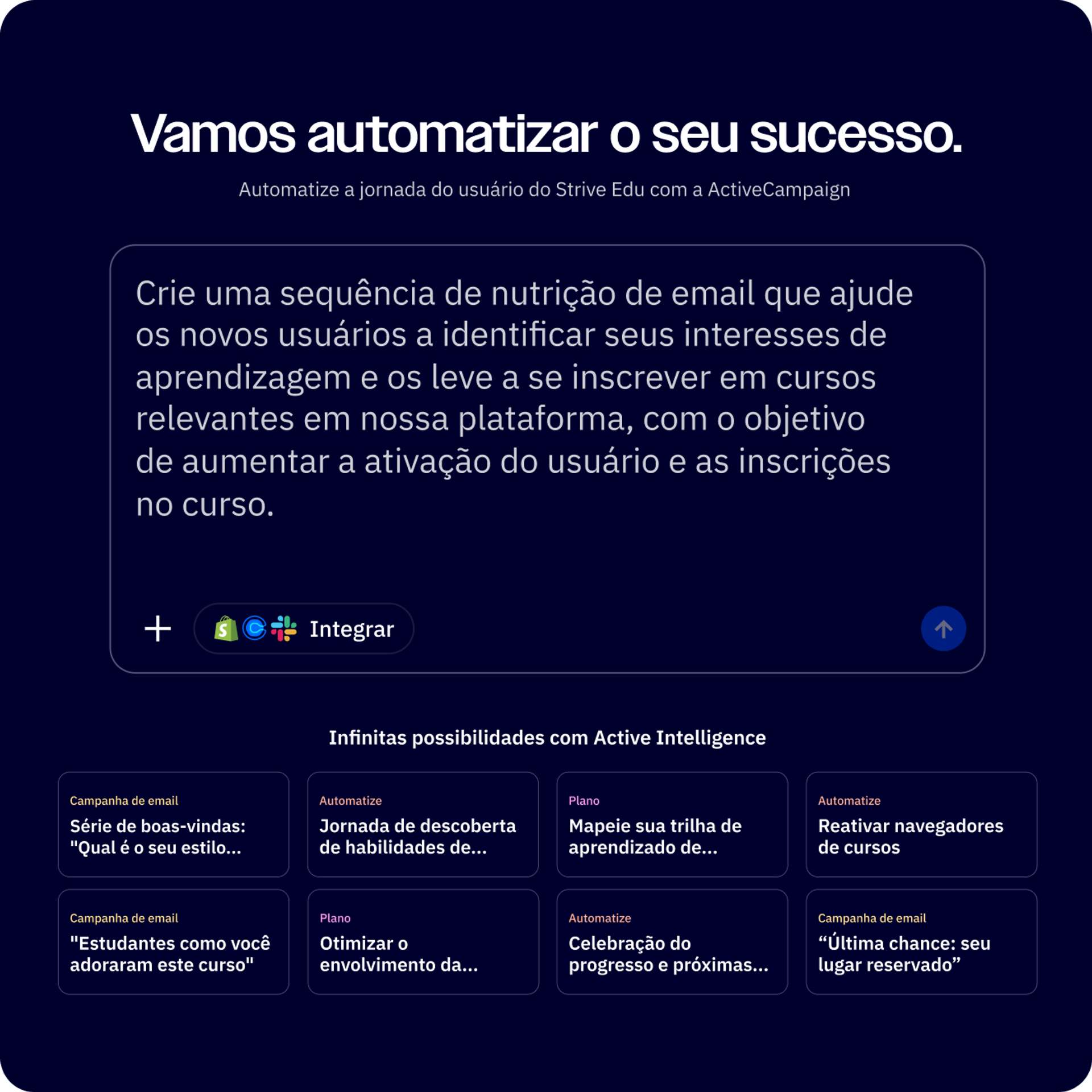 O Active Intelligence foi criado especificamente para marketing e treinado com base em bilhões de interações reais de clientes por email, SMS, WhatsApp e muito mais. Ao contrário das ferramentas genéricas de IA, o Active Intelligence entende o contexto de marketing, sabe o que gera resultados e fornece recomendações acionáveis adaptadas às suas metas de negócios. Em vez de estar separada, essa ferramenta está integrada a todas as partes de seu fluxo de trabalho de marketing.