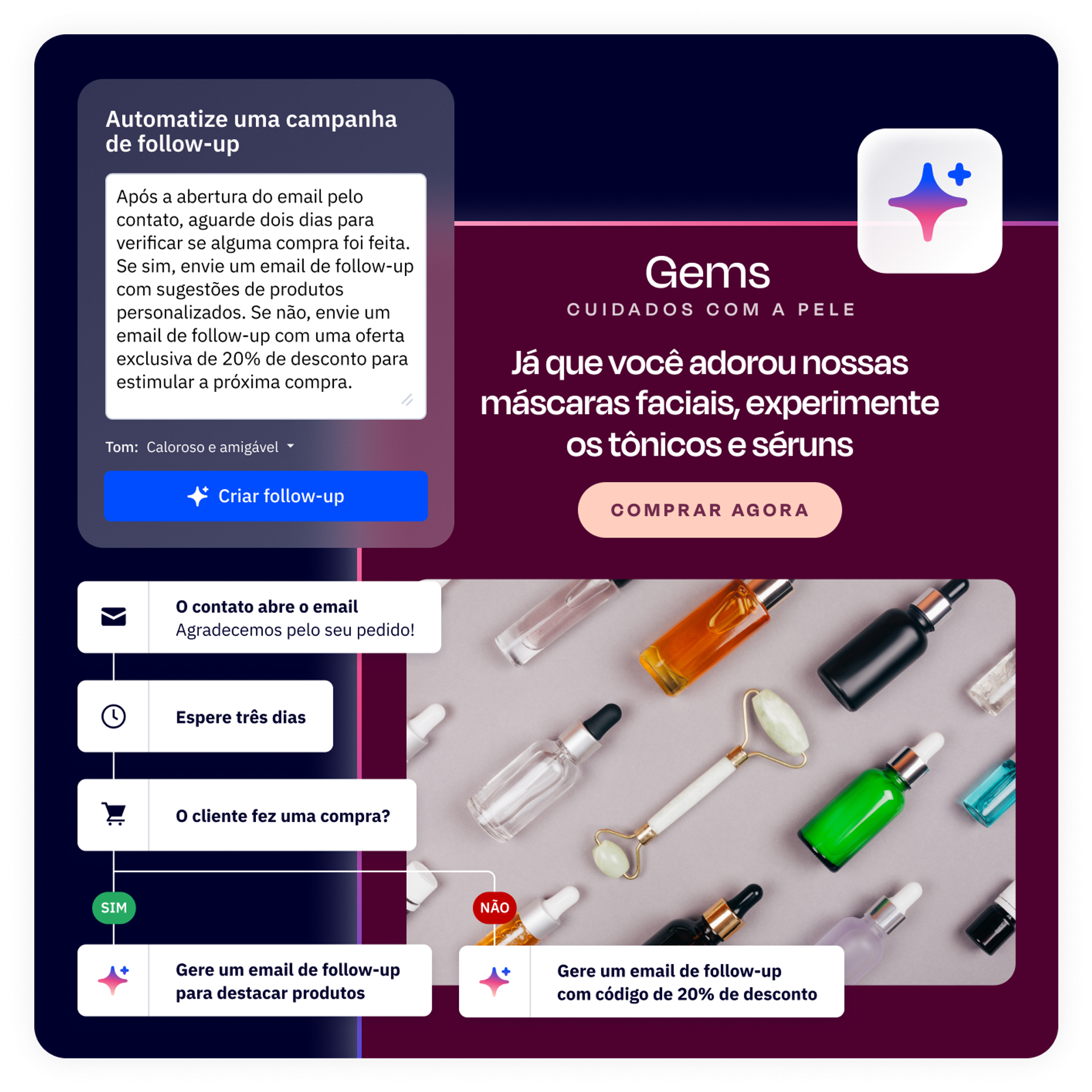 Crie e lance campanhas por email, SMS e WhatsApp rapidamente. A IA cuida da execução para que você possa agir rapidamente e se concentrar no que é mais importante.