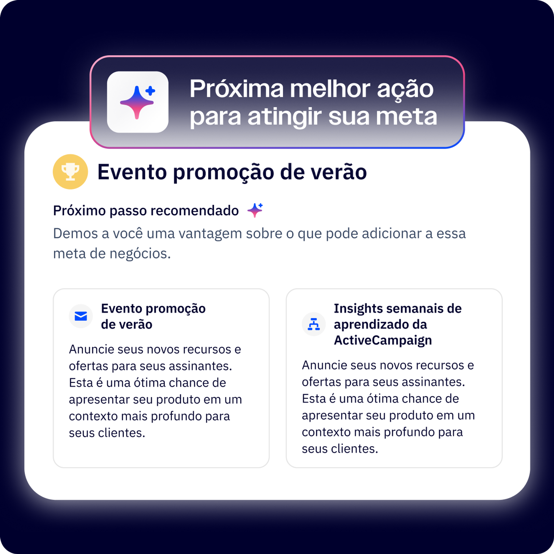 O Active Intelligence é o mecanismo de IA que alimenta a plataforma de marketing autônomo da ActiveCampaign. O Active Intelligence analisa bilhões de pontos de dados de interações com clientes para fornecer recomendações estratégicas, prever o que funcionará melhor para seu público e orientar suas decisões de marketing. Pense nele como seu estrategista de marketing com tecnologia de IA que nunca para de aprender e otimizar.