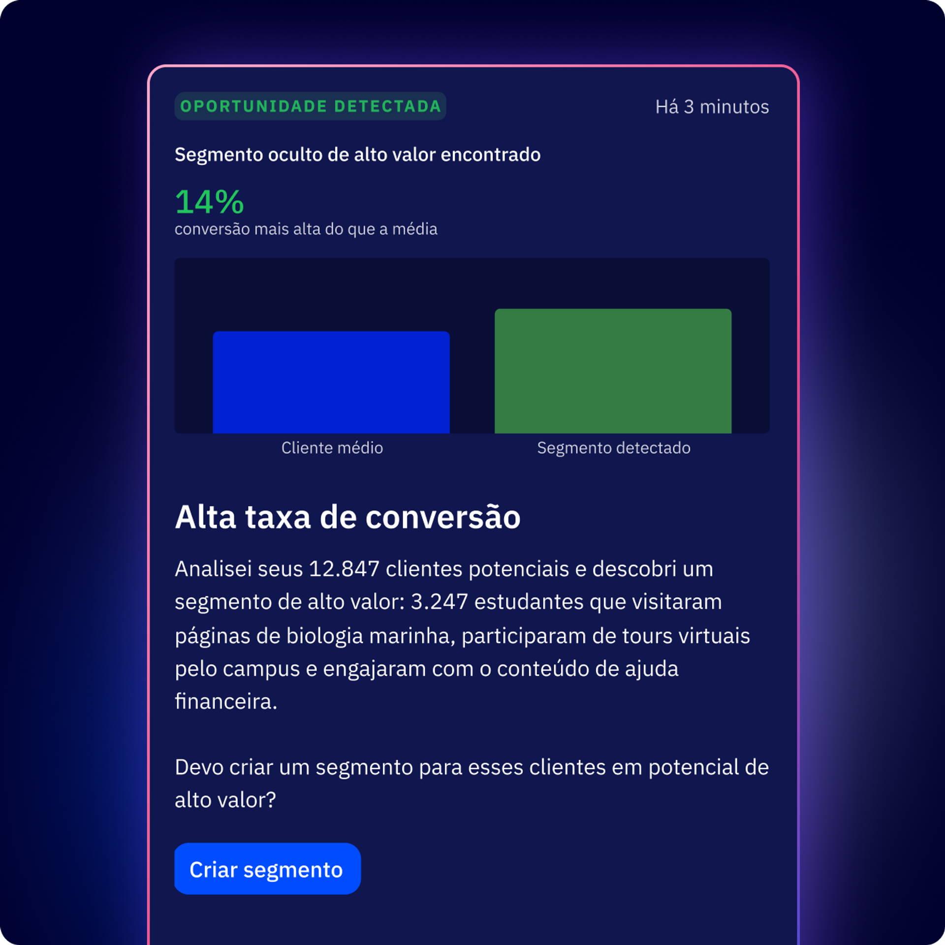 Veja como a IA analisa os dados de seu público e cria segmentos inteligentes em segundos.