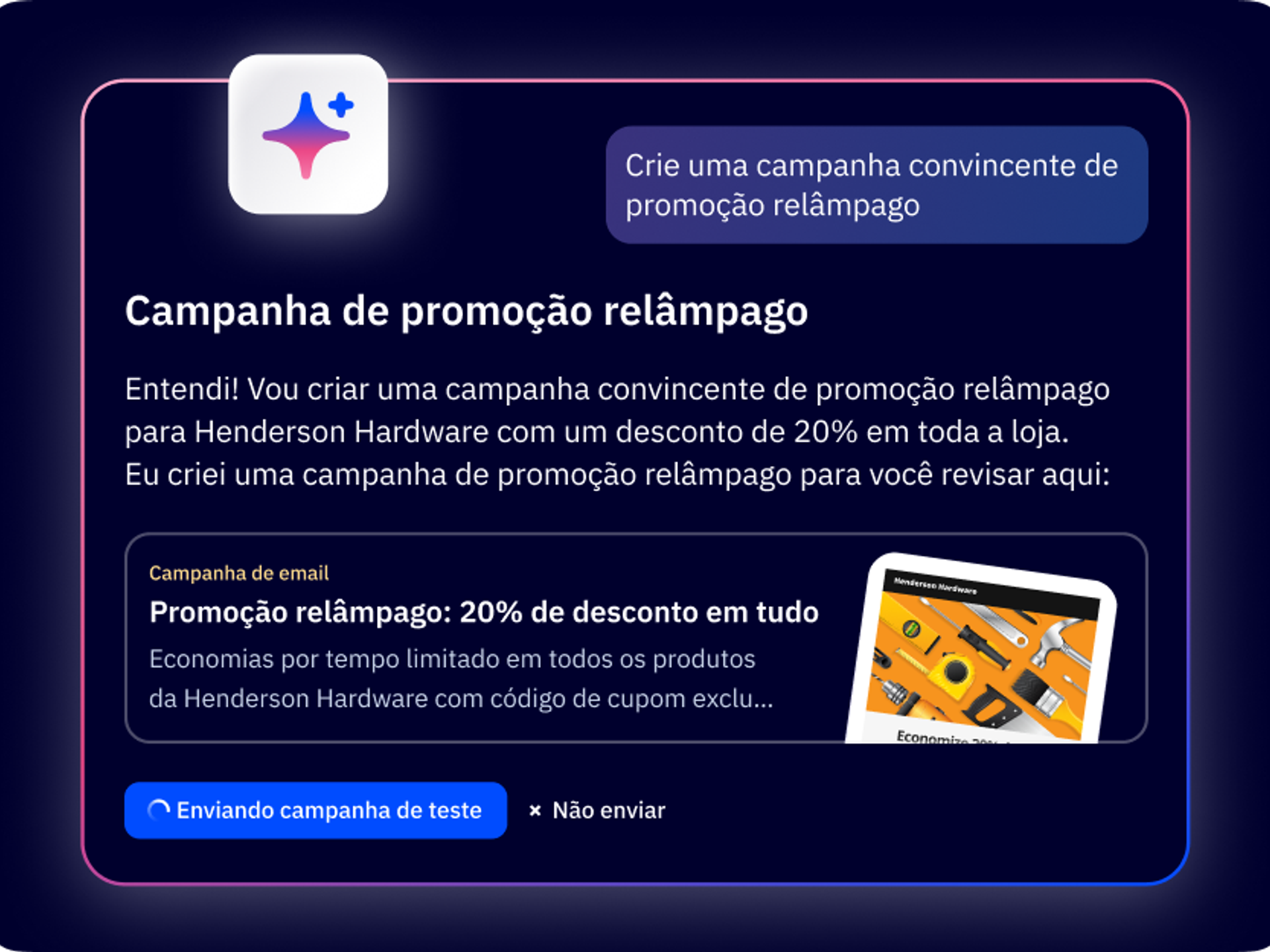Nossa plataforma de marketing autônomo cuida do seu marketing, incluindo campanhas de email, mensagens SMS, conversas no WhatsApp e muito mais. Em vez de você fazer todo o trabalho, a Active Intelligence orienta sua estratégia e cuida do trabalho pesado. Você se concentra em suas metas de negócios enquanto os agentes de IA imaginam, ativam e validam seu marketing para você.
