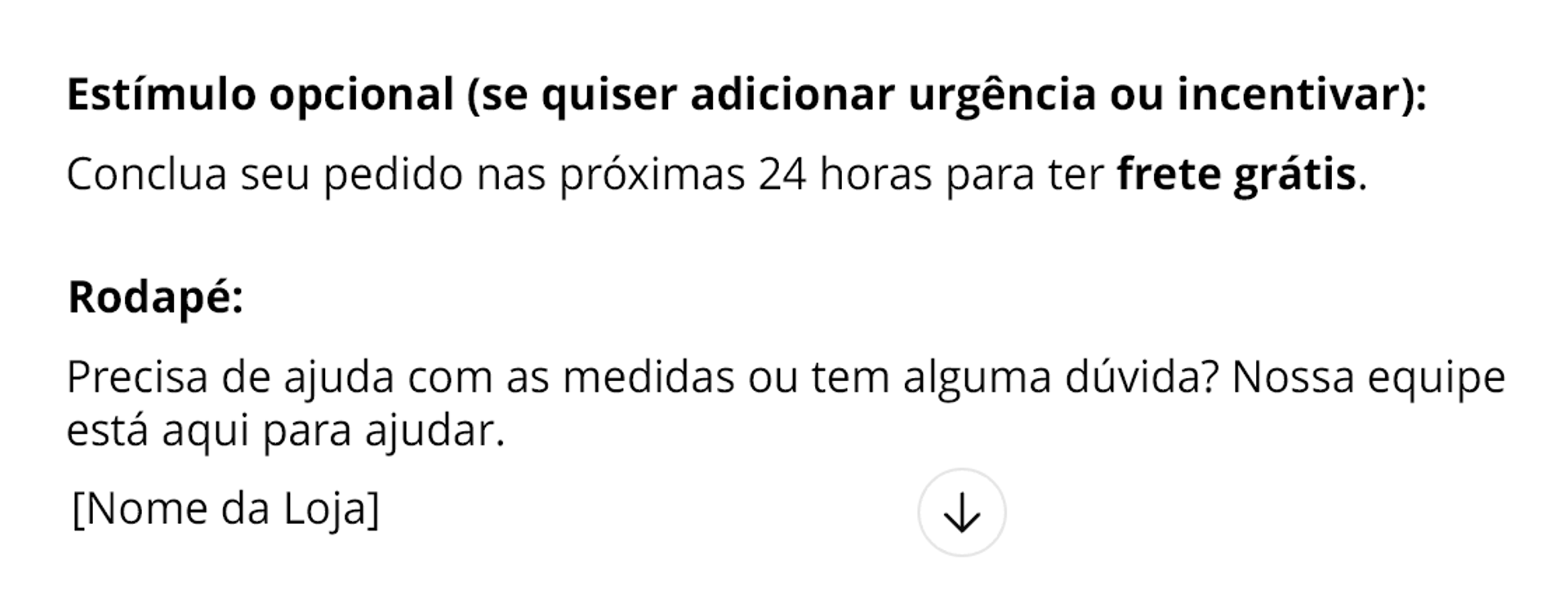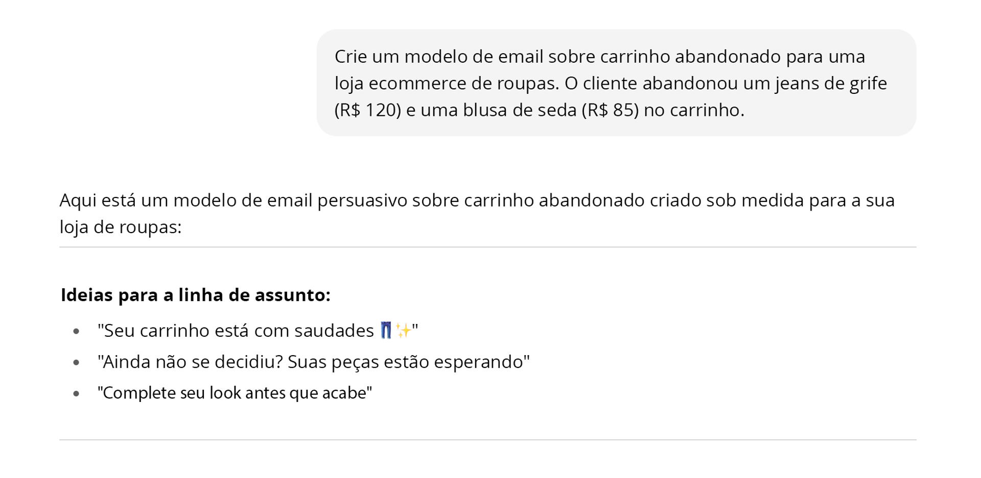 O segredo dos modelos gerados por IA está em como o pedido é estruturado. Em vez de navegar por categorias como "Ecommerce > Carrinho abandonado > Estilo moderno", você descreve a situação específica em linguagem natural.