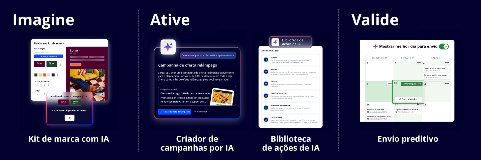 Ao usar a IA em todos os três pilares, você cria um fluxo de trabalho autônomo e contínuo que faz a pesquisa de público, monta campanhas, otimiza mensagens, mensura resultados, sugere os próximos passos e melhora sozinha a cada nova campanha. Isso sim é marketing inteligente.