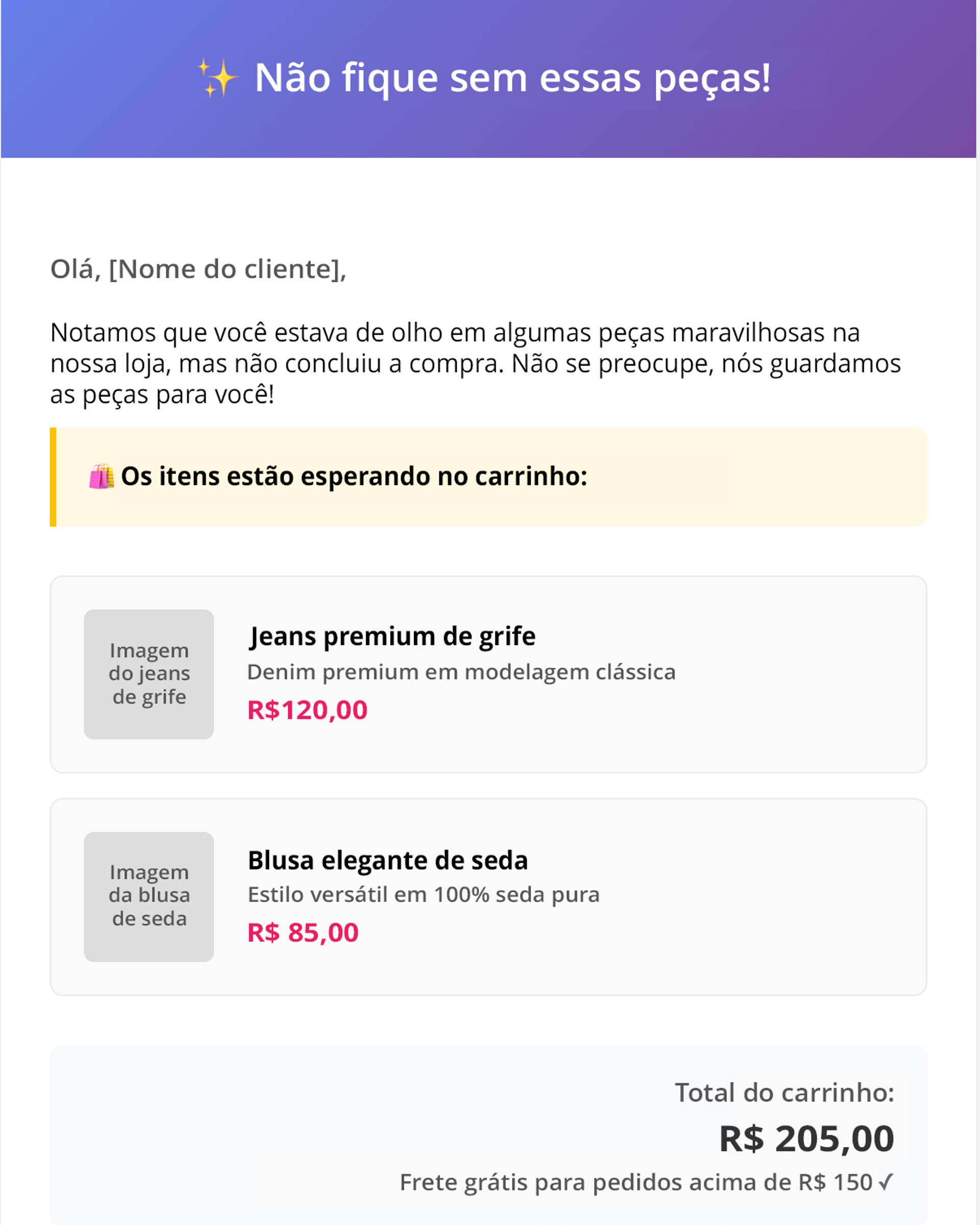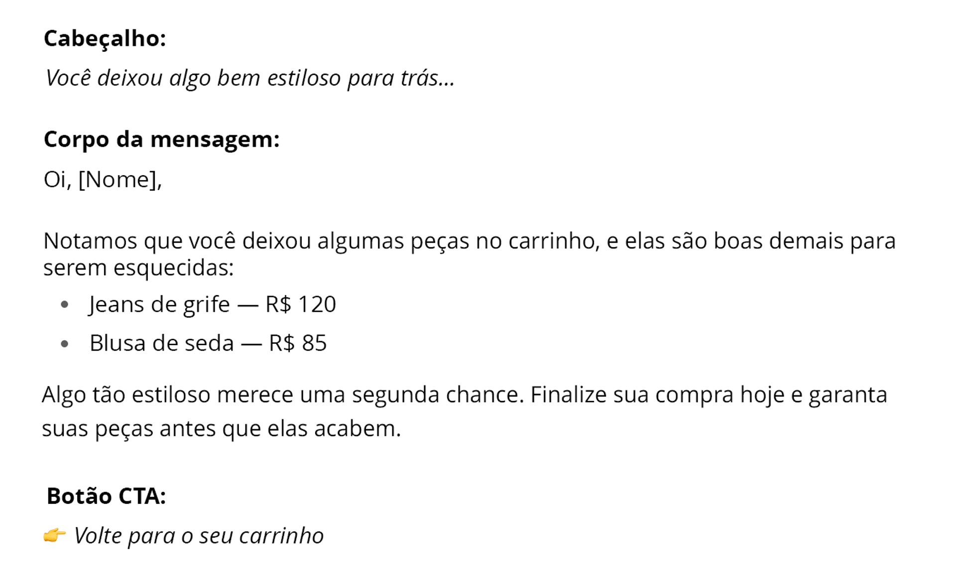 Crie um modelo de email de carrinho abandonado para um ecommerce de roupas. O cliente deixou no carrinho uma calça jeans de grife (120 dólares) e uma blusa de seda (85 dólares).