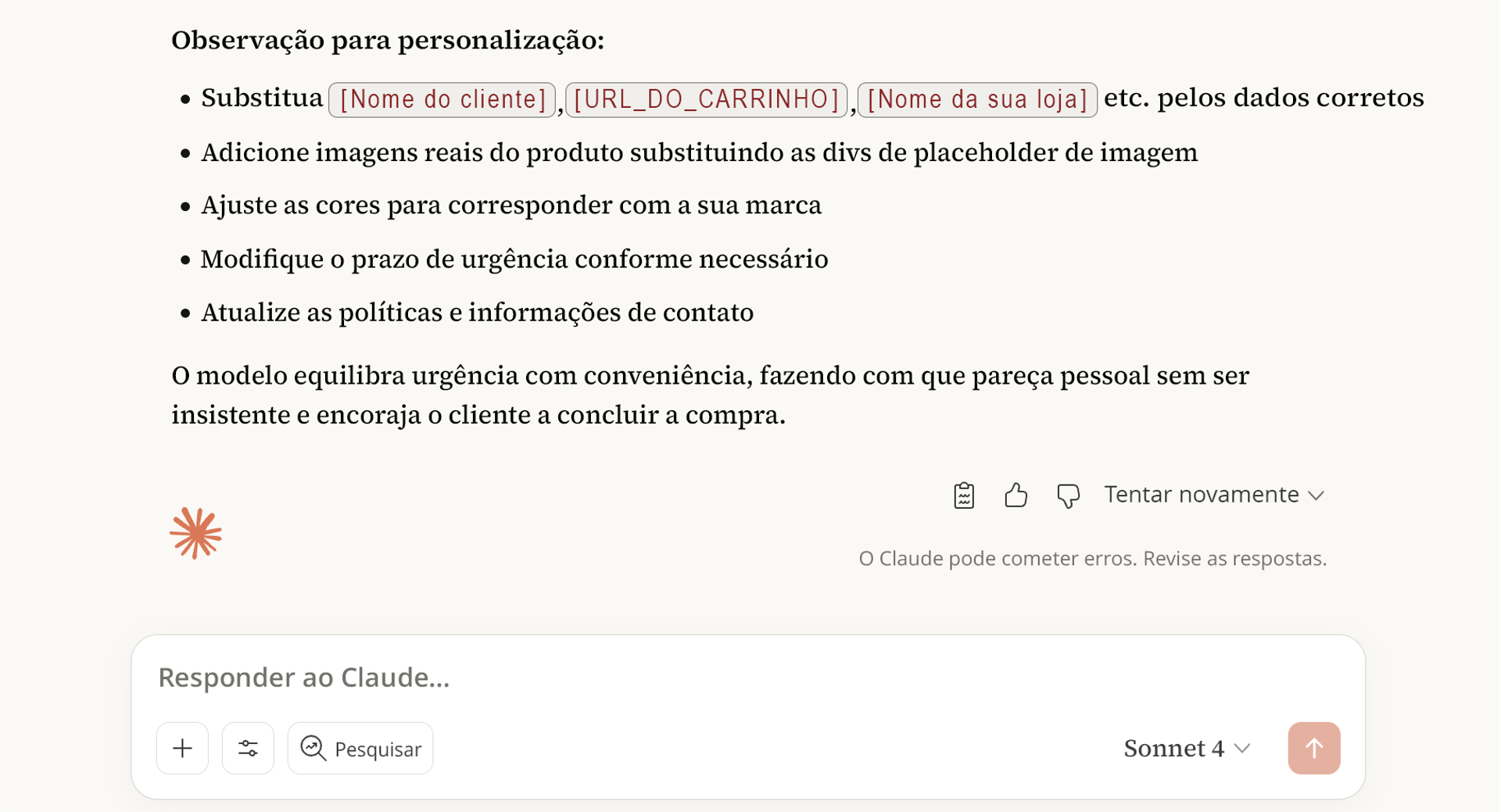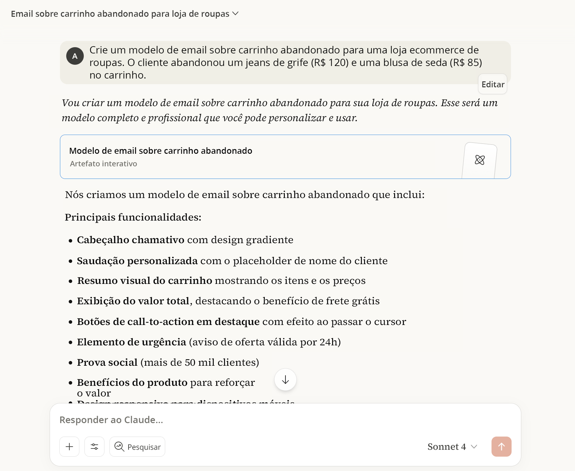 Além disso, o Claude escreveu uma lista com tópicos detalhando o que torna especiais as peças que o cliente deixou no carrinho, com um CTA no final que diz: "Garantir meus itens agora". Assim como vimos no ChatGPT, tudo isso se apoia nas táticas típicas de urgência que a maioria dos emails de carrinho abandonado usa.