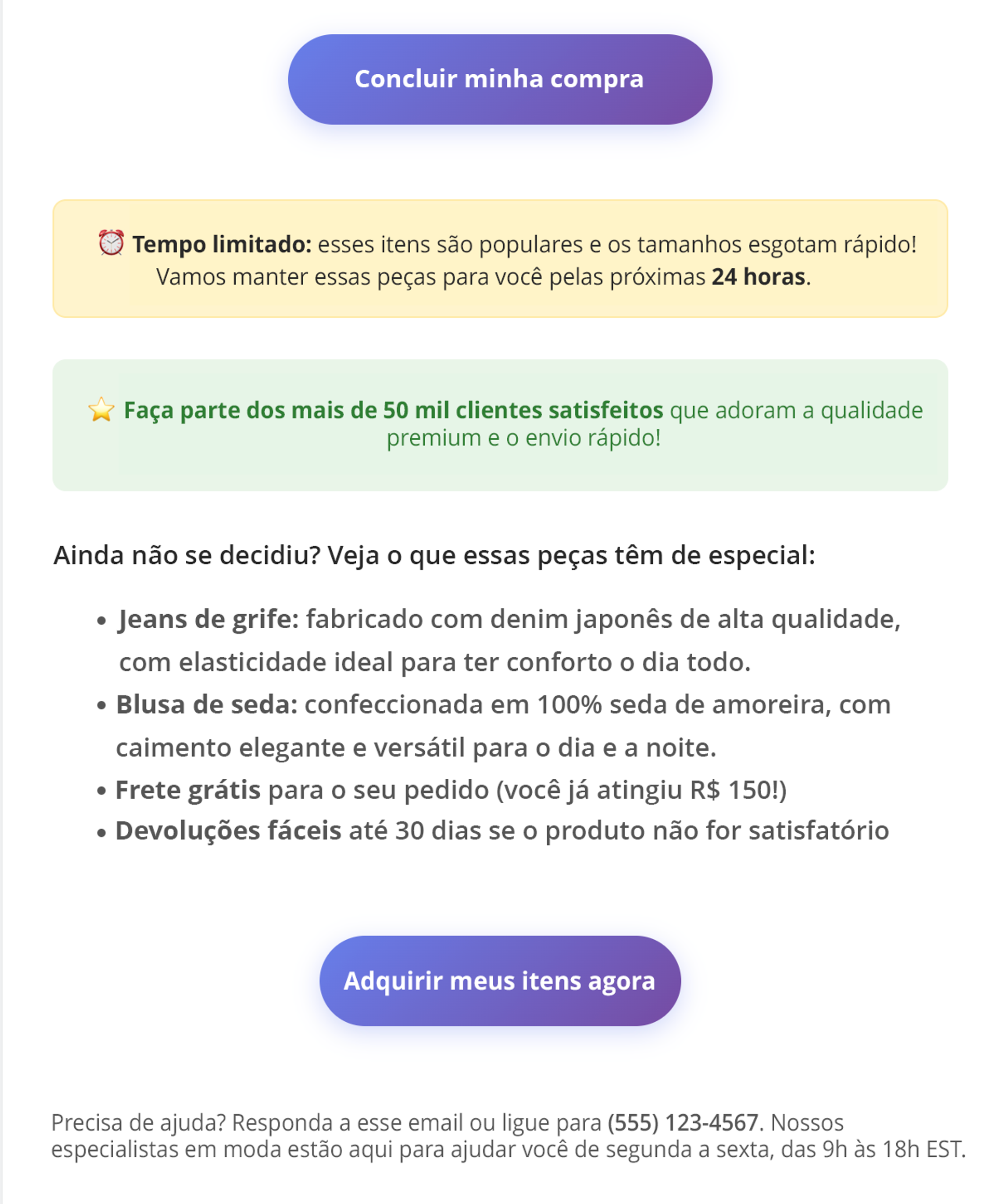 A abordagem pareceu familiar, mas genérica, pois se baseou em uma linguagem padrão de ecommerce e táticas convencionais de urgência. O corpo do email usou frases como: "Seu bom gosto merece uma segunda chance. Finalize a compra hoje e garanta as peças antes que esgotem."