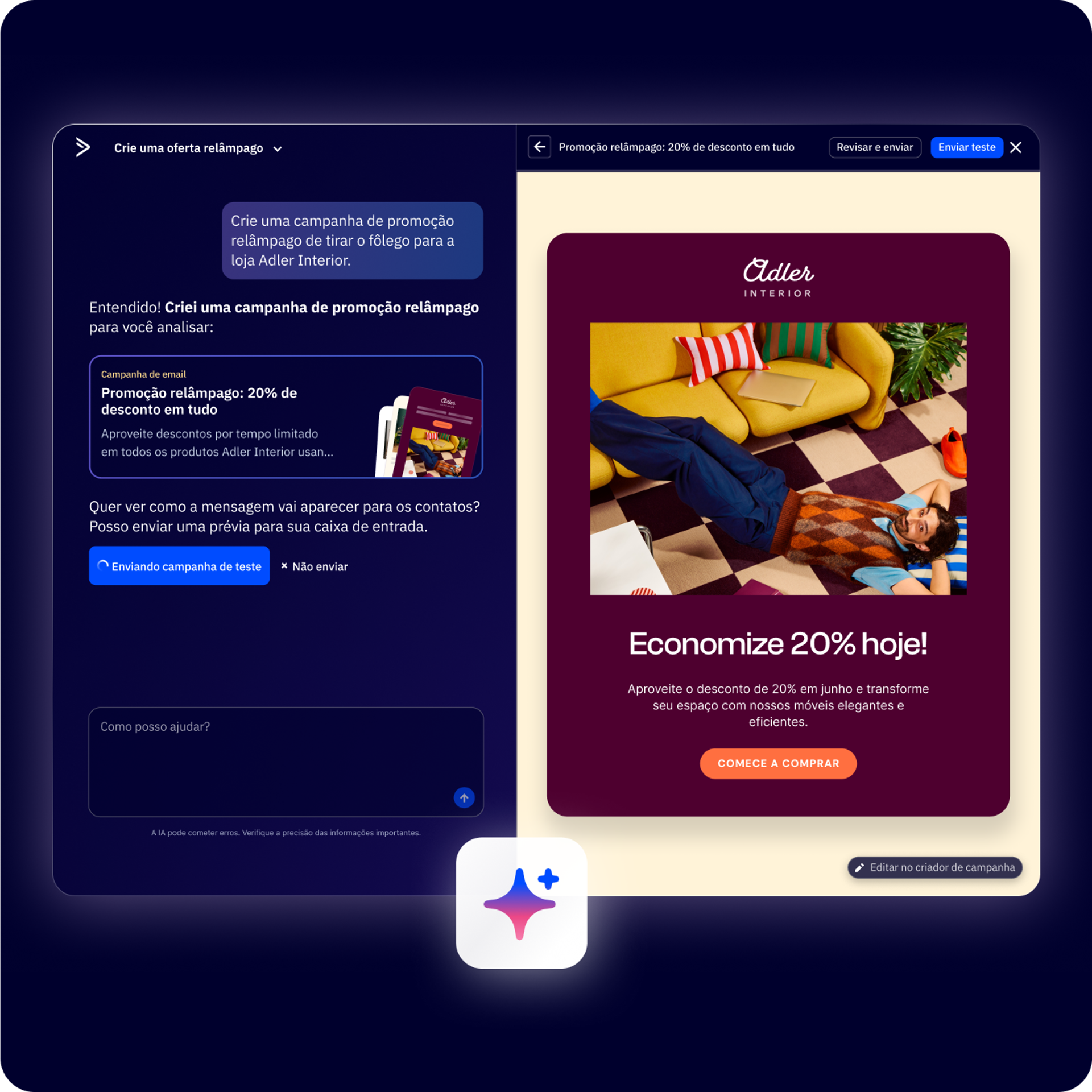 A IA consegue criar campanhas e conteúdo melhores porque considera os seus objetivos, analisa os dados dos seus clientes e entrega modelos, mensagens e recomendações sob medida especificamente para essas pessoas, otimizando o engajamento e a relevância.