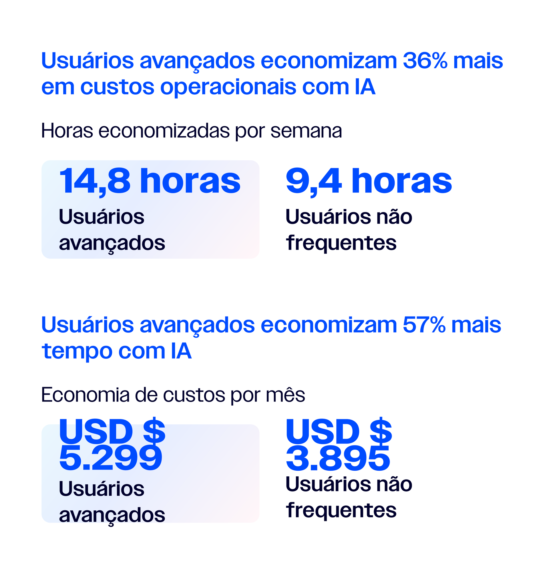 E os benefícios são quase o dobro para usuários avançados, aqueles que usam IA diariamente. Essas pessoas estão economizando 36% a mais em custos operacionais e 57% a mais em tempo apenas por usar a IA.