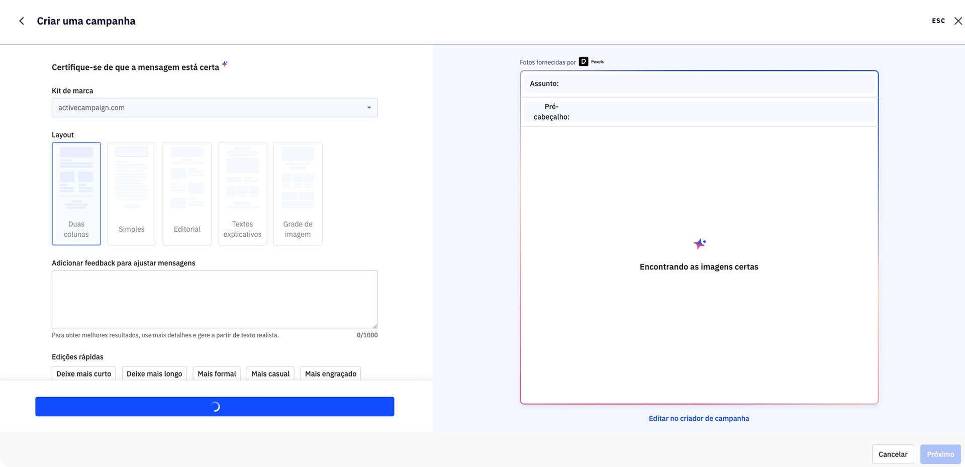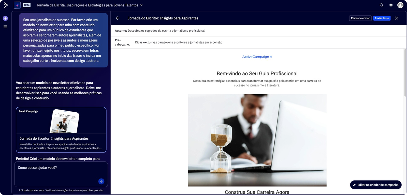 Ao enviar um prompt para o Active Intelligence, a plataforma começa a trabalhar e constrói para você um modelo de newsletter personalizado para seu público e sua marca.