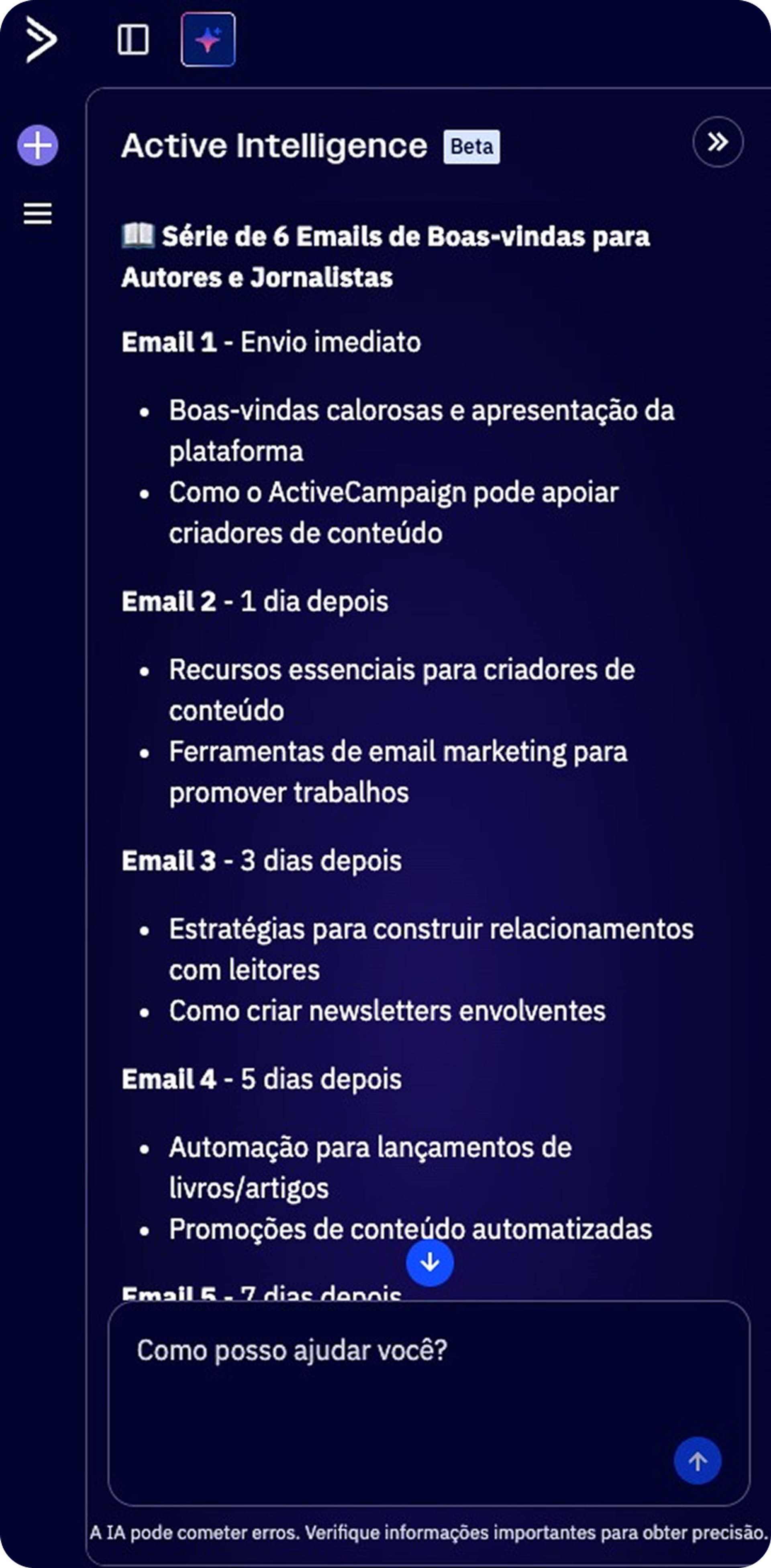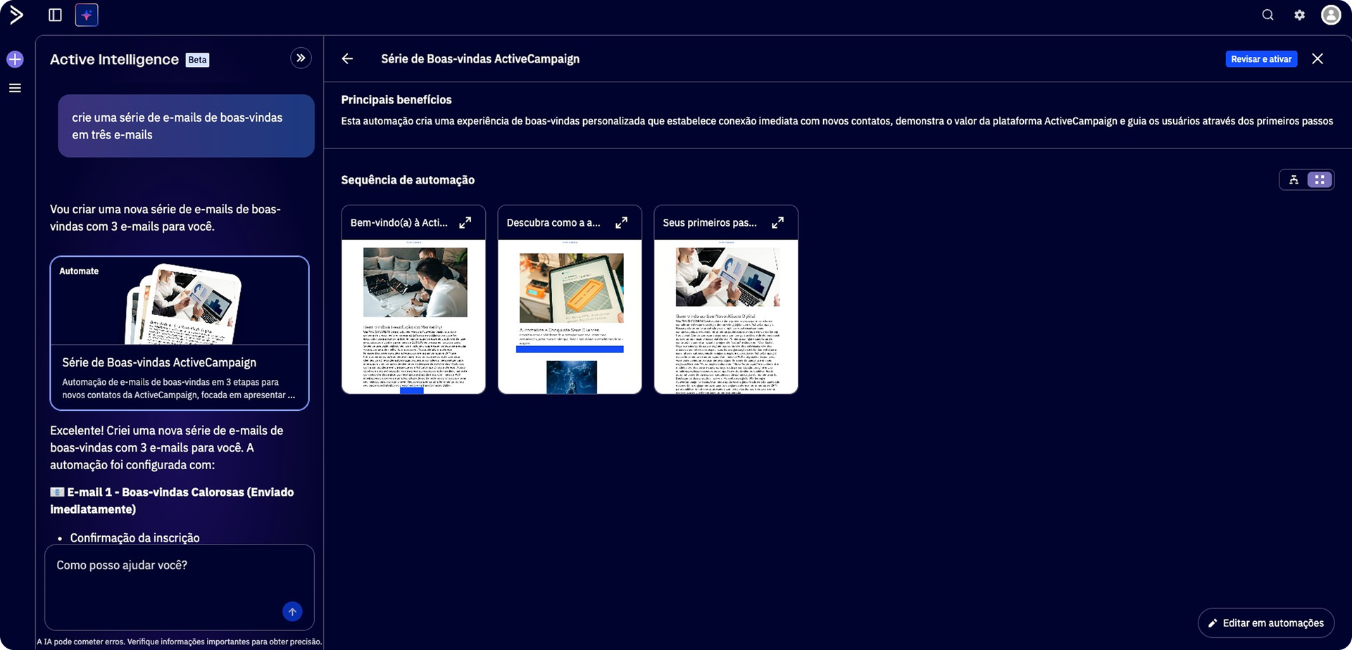 Montar uma sequência de boas-vindas não precisa ser difícil. Envie o prompt para o Active Intelligence e a sequência inteira será construída em menos de um minuto.