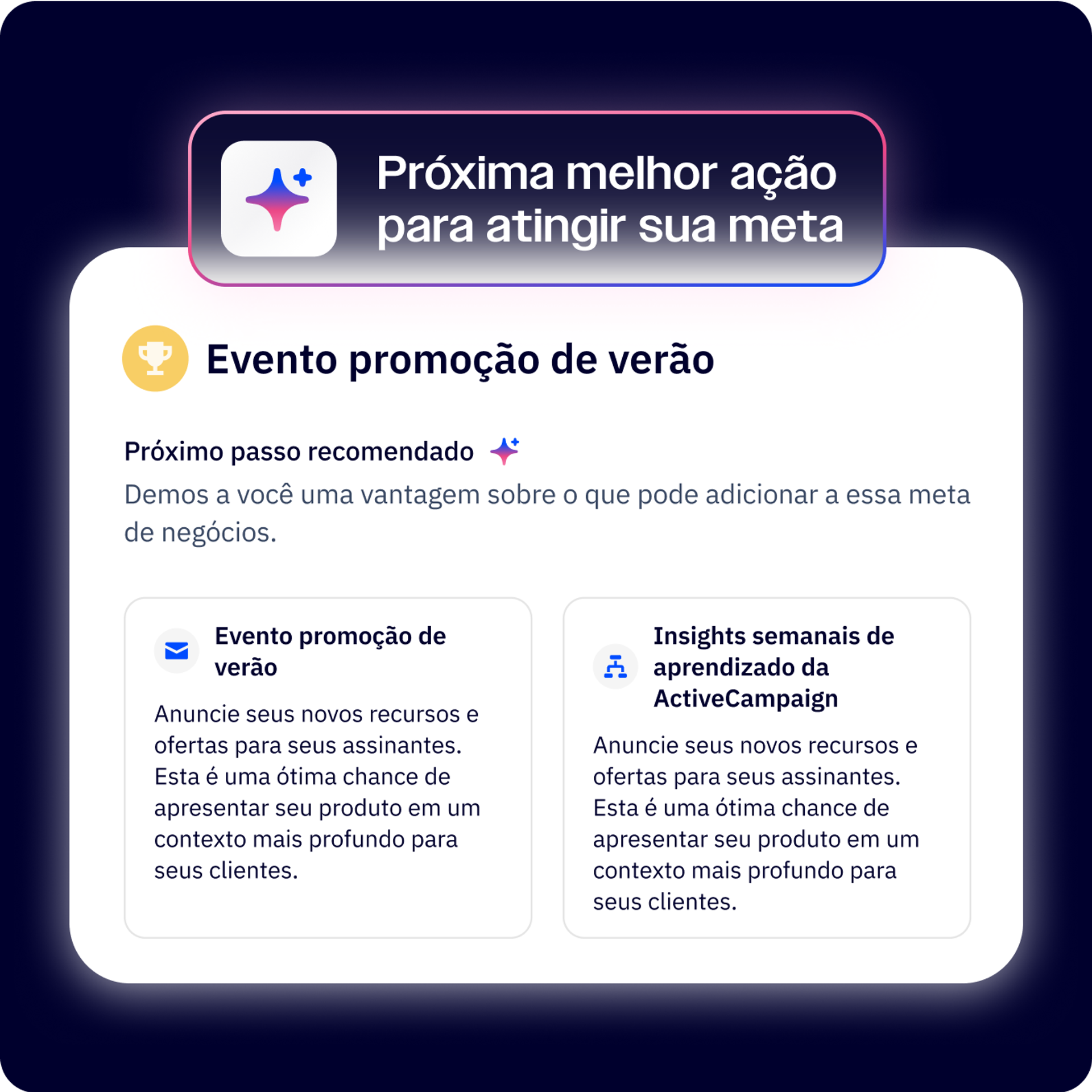 Você não precisa mais se esforçar para transformar dados em ações. As metas de negócios oferecem recomendações com suporte de IA e um painel unificado que mostra o que está funcionando e o que deve ser feito em seguida.