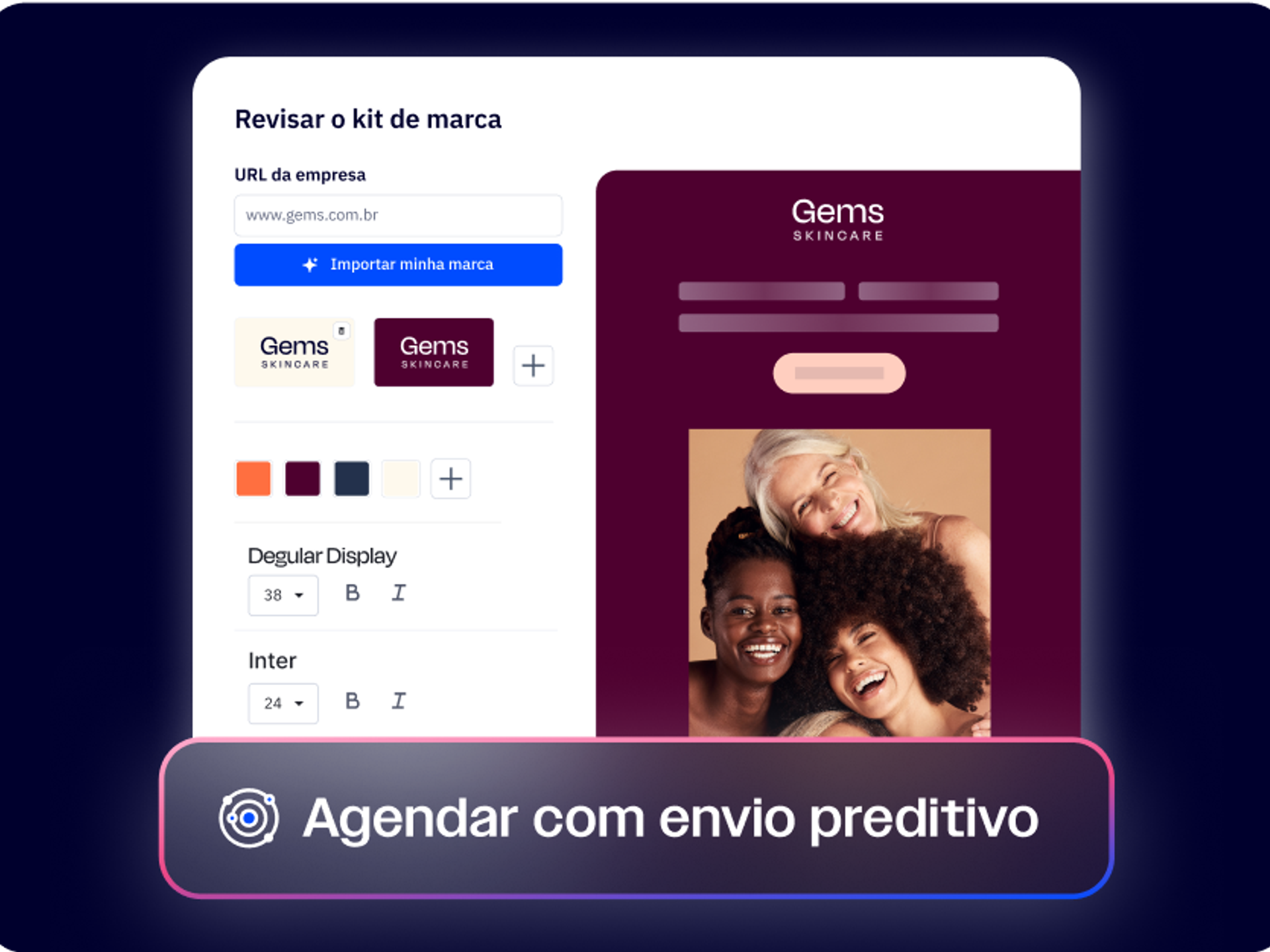 Ignore a formatação e vá direto para o envio. Importe sua identidade de marca a partir do seu site em segundos.